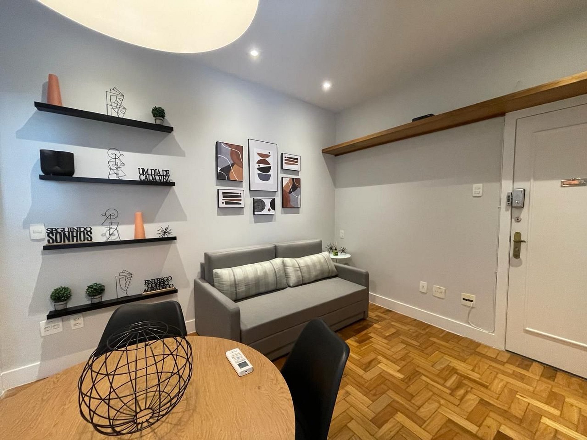 O apartamento é dividido em 1 quarto com cama queen size, sala de jantar e estar com sofá-cama, banheiro social e cozinha.