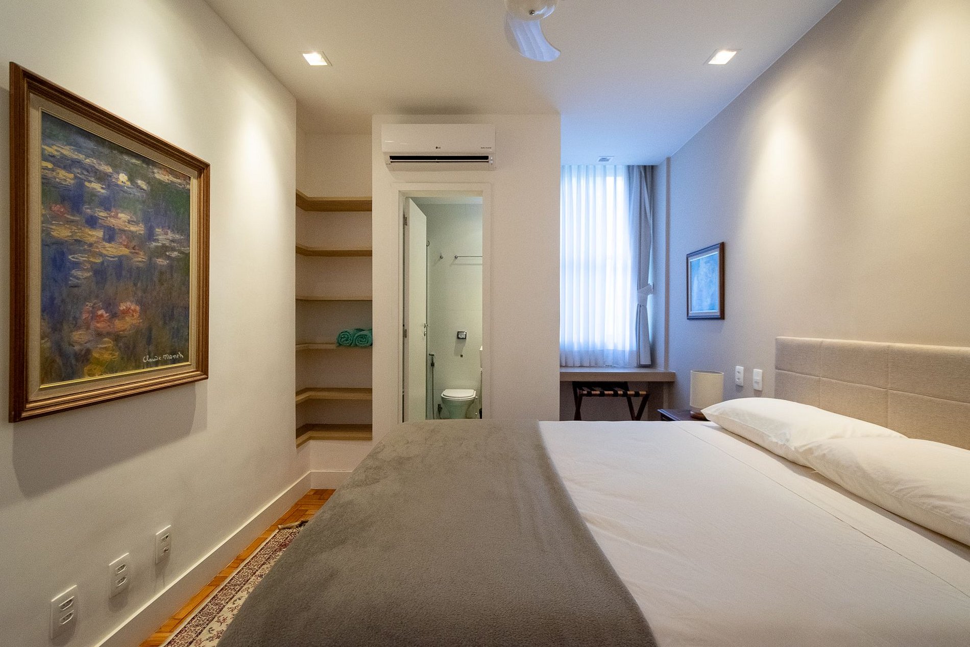 O apartamento tem uma área privativa total de 65m² e é dividido em sala de estar e jantar, 2 quartos sendo 1 suíte, 1 banheiro social e cozinha com area de serviço. O apartamento, que acomoda até 4 hóspedes, é de fundos, 2° andar, sol da manhã, muito iluminado durante o dia, ultra silencioso à noite e tem vista para uma praça com jardim. A sala está equipada com SmartTV de 40”. A cozinha possui armários planejados, geladeira duplex, fogão com forno, exaustor, micro-ondas, máquina lava & seca para roupas, cafeteira elétrica Nespresso, sanduicheira elétrica, liquidificador, secador de cabelo, ferro de passar roupa, aquecedor central de água (a gás), varal para roupas, etc. A suíte possui uma confortável cama de casal tamanho queen, arara para roupas, maleiros retráteis, uma estação de trabalho com tomadas para computador e tomada USB para carregamento de dispositivos. O segundo quarto tem duas confortáveis camas de solteiro, que podem ser unidas para servir outro casal, um armário aberto, uma bancada de trabalho de 2 metros de largura para atender a duas pessoas com tomadas para computador e tomada USB para carregamento de dispositivos. O imóvel possui internet ultrarrápida de 300mb em fibra ótica (tanto wi-fi quanto a cabo nos pontos de trabalho), aquecimento de água a gás nos 2 banheiros e na cozinha, ar condicionado split dual inverter em todos os ambientes, além de ventiladores de teto. Todas as tomadas são de 127 volts e aterradas no novo padrão brasileiro de 3 pinos, sendo algumas de 20 amperes para plugs mais grossos. O condomínio, de uso exclusivamente residencial, oferece (e exige de todos) um ambiente familiar tranquilo, dispondo de um elevador social, interfone, sistema interno de câmeras (cftv) e porteiro 24 horas – exceto nos horários de refeições e de serviços de zeladoria. No caso de estadias longas, existe a possibilidade de alugar, à parte, uma vaga de garagem no próprio prédio para um veículo médio, não inclusa no aluguel e sujeita à disponibilidade. A consulta de preço e disponibilidade deve ser feita com antecedência. Porém na mesma quadra, a poucos metros do apartamento, existe um Estacionamento rotativo da “Estapar” aberto 24 horas.
