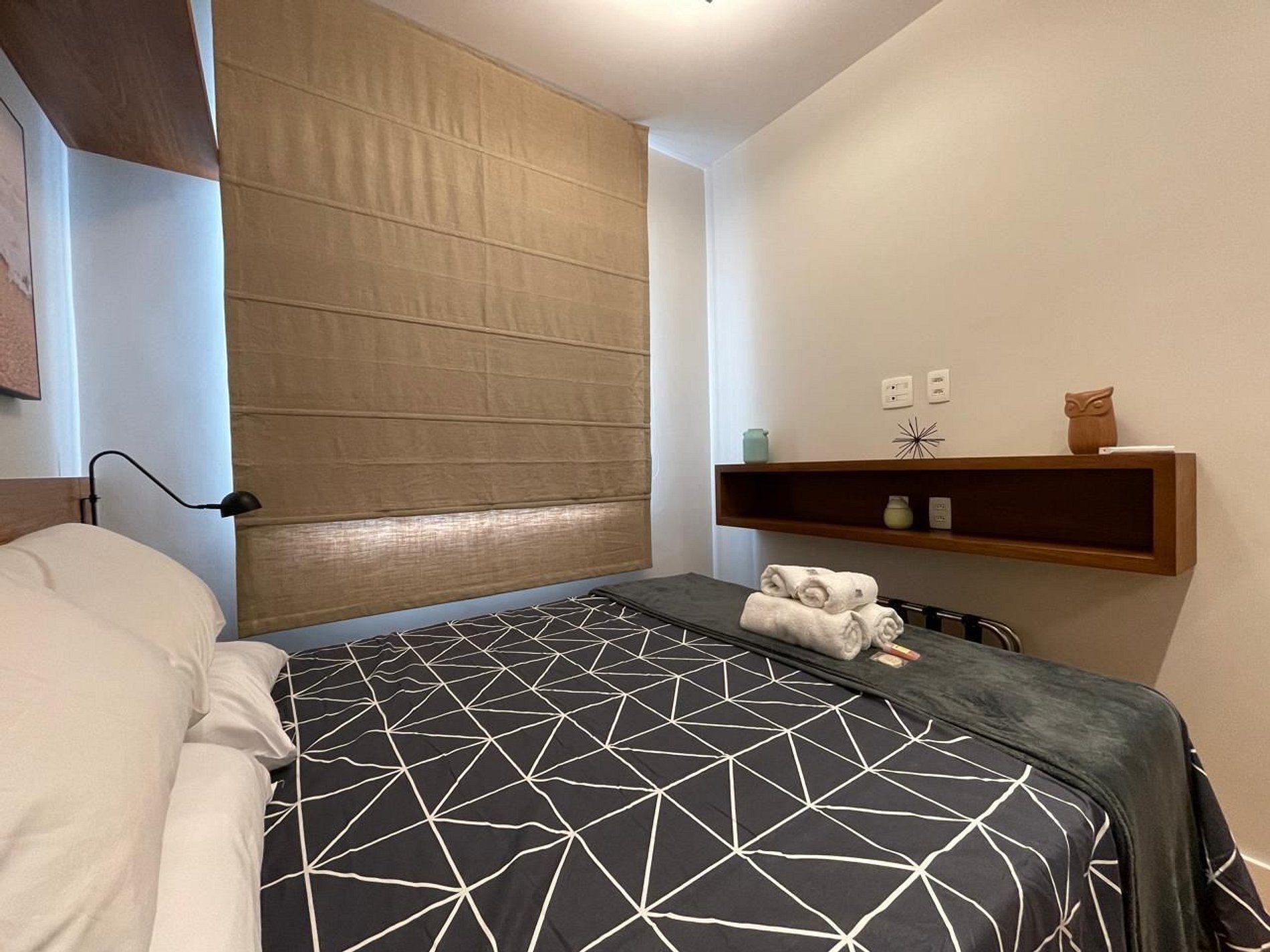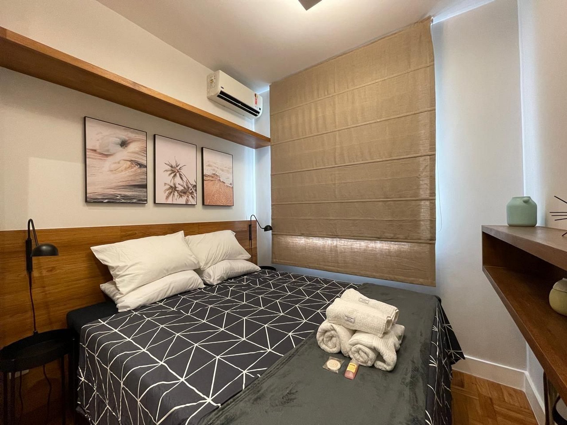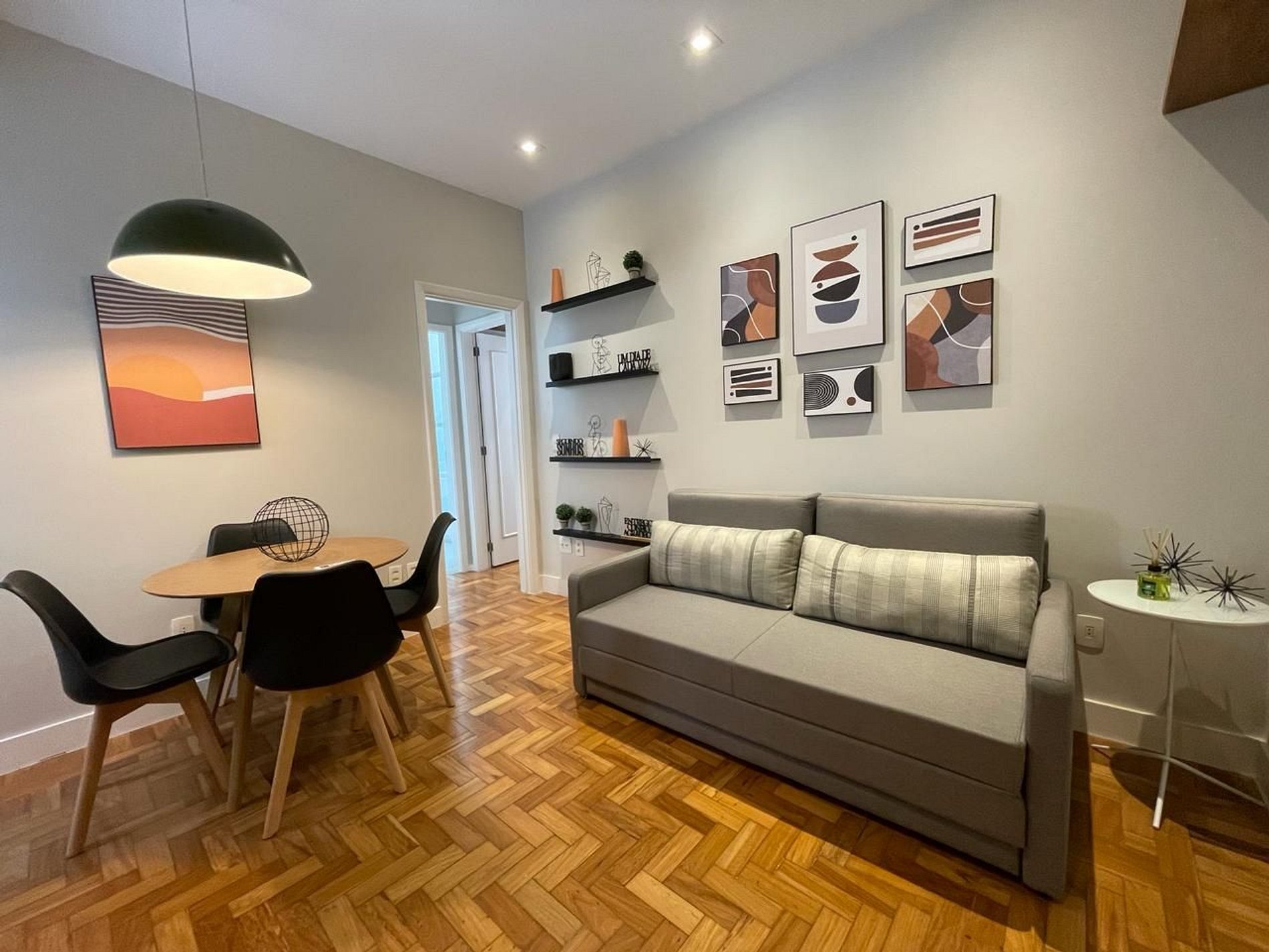 O apartamento é dividido em 1 quarto com cama queen size, sala de jantar e estar com sofá-cama, banheiro social e cozinha.