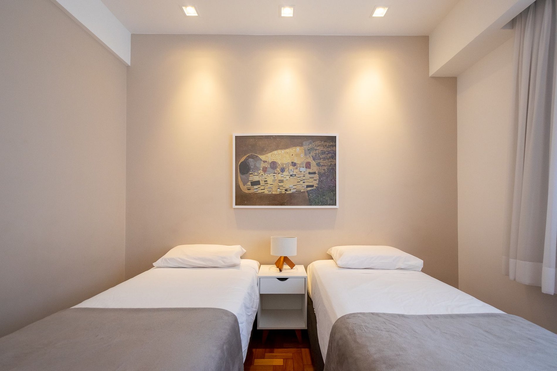 O apartamento tem uma área privativa total de 65m² e é dividido em sala de estar e jantar, 2 quartos sendo 1 suíte, 1 banheiro social e cozinha com area de serviço. O apartamento, que acomoda até 4 hóspedes, é de fundos, 2° andar, sol da manhã, muito iluminado durante o dia, ultra silencioso à noite e tem vista para uma praça com jardim. A sala está equipada com SmartTV de 40”. A cozinha possui armários planejados, geladeira duplex, fogão com forno, exaustor, micro-ondas, máquina lava & seca para roupas, cafeteira elétrica Nespresso, sanduicheira elétrica, liquidificador, secador de cabelo, ferro de passar roupa, aquecedor central de água (a gás), varal para roupas, etc. A suíte possui uma confortável cama de casal tamanho queen, arara para roupas, maleiros retráteis, uma estação de trabalho com tomadas para computador e tomada USB para carregamento de dispositivos. O segundo quarto tem duas confortáveis camas de solteiro, que podem ser unidas para servir outro casal, um armário aberto, uma bancada de trabalho de 2 metros de largura para atender a duas pessoas com tomadas para computador e tomada USB para carregamento de dispositivos. O imóvel possui internet ultrarrápida de 300mb em fibra ótica (tanto wi-fi quanto a cabo nos pontos de trabalho), aquecimento de água a gás nos 2 banheiros e na cozinha, ar condicionado split dual inverter em todos os ambientes, além de ventiladores de teto. Todas as tomadas são de 127 volts e aterradas no novo padrão brasileiro de 3 pinos, sendo algumas de 20 amperes para plugs mais grossos. O condomínio, de uso exclusivamente residencial, oferece (e exige de todos) um ambiente familiar tranquilo, dispondo de um elevador social, interfone, sistema interno de câmeras (cftv) e porteiro 24 horas – exceto nos horários de refeições e de serviços de zeladoria. No caso de estadias longas, existe a possibilidade de alugar, à parte, uma vaga de garagem no próprio prédio para um veículo médio, não inclusa no aluguel e sujeita à disponibilidade. A consulta de preço e disponibilidade deve ser feita com antecedência. Porém na mesma quadra, a poucos metros do apartamento, existe um Estacionamento rotativo da “Estapar” aberto 24 horas.