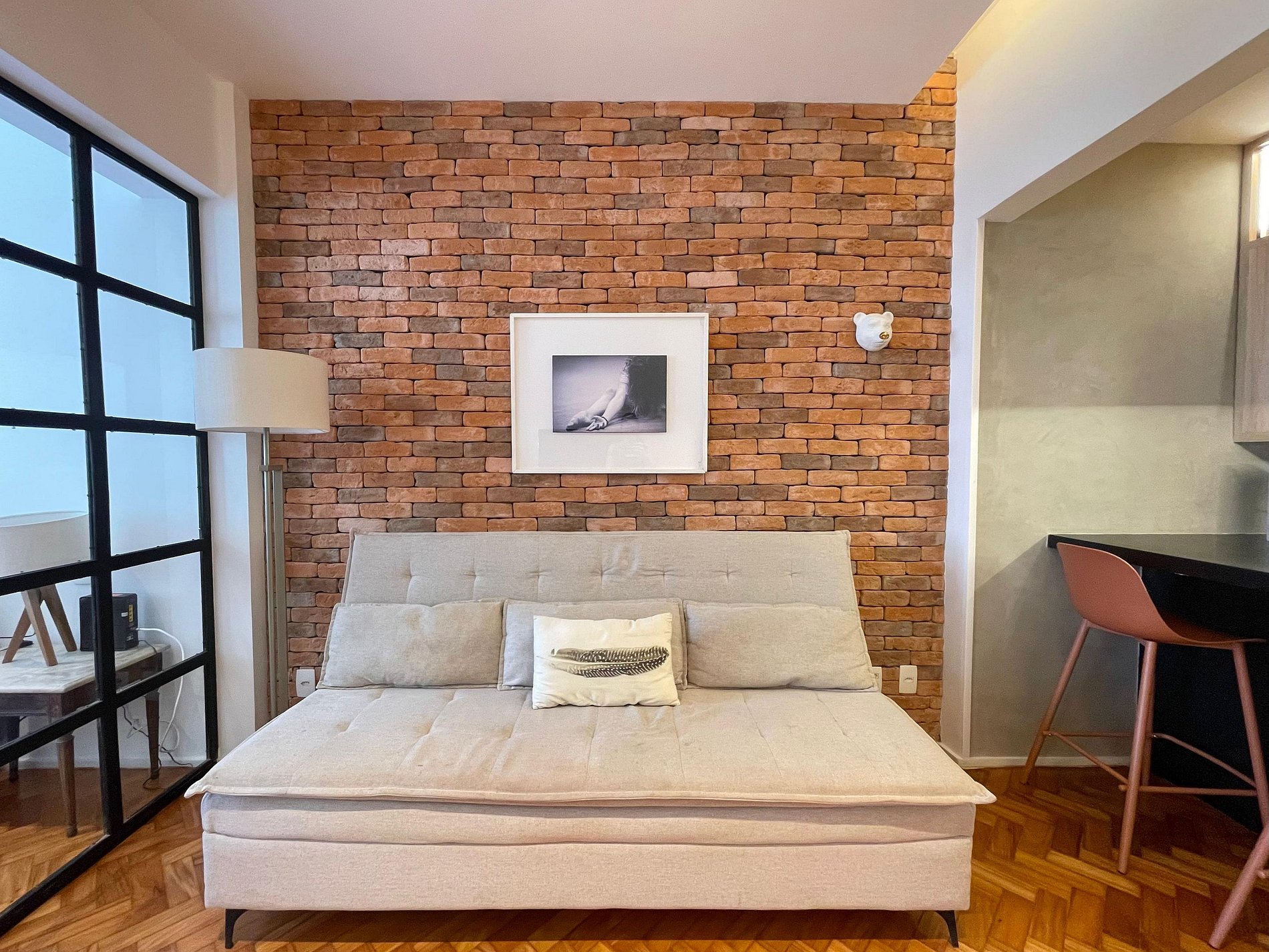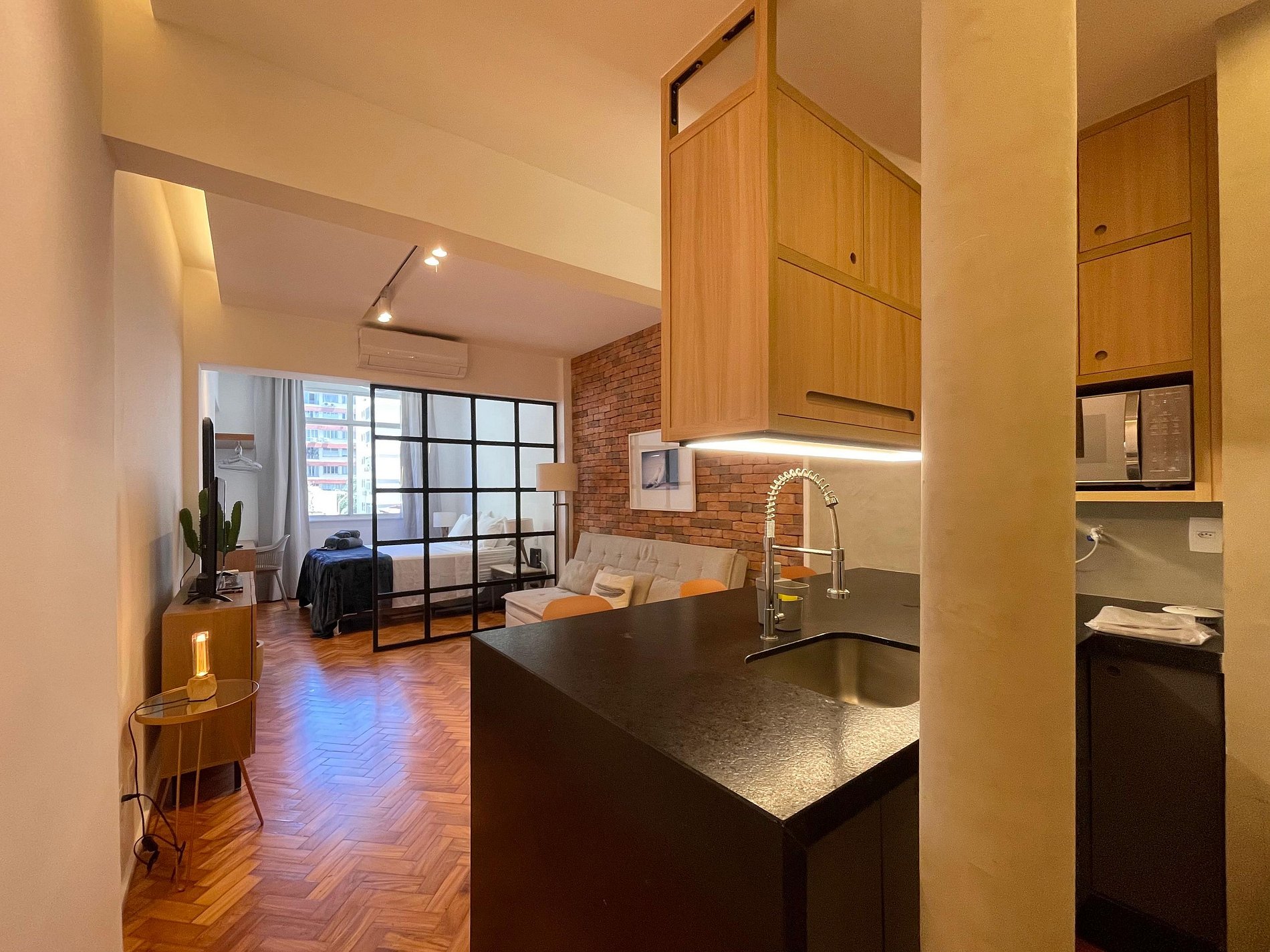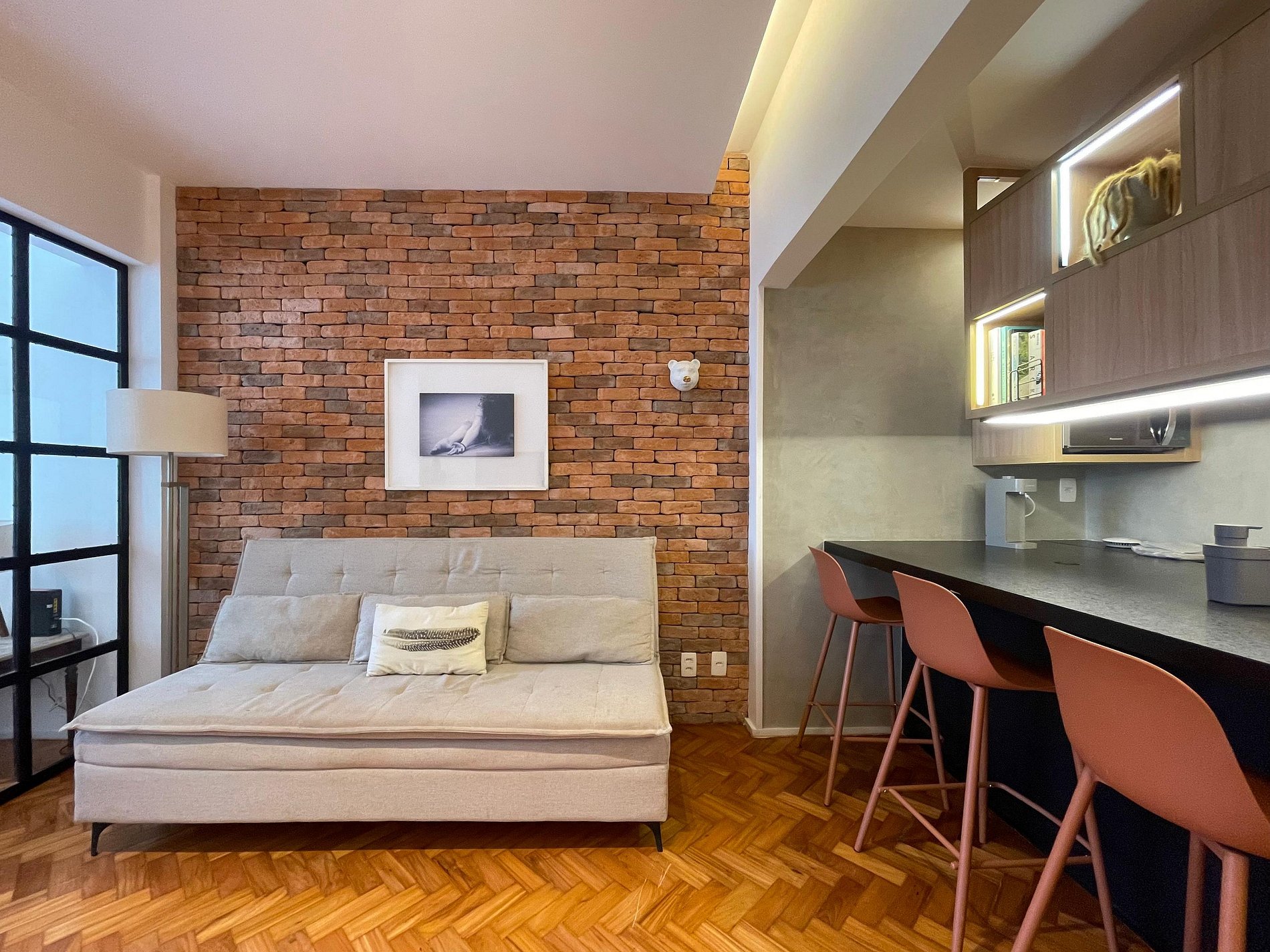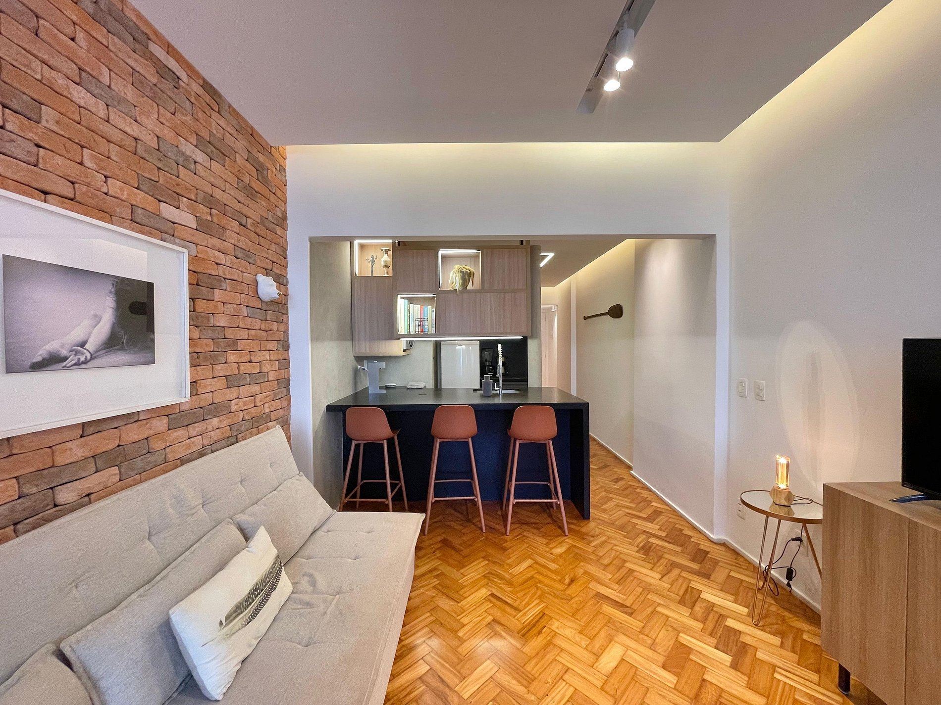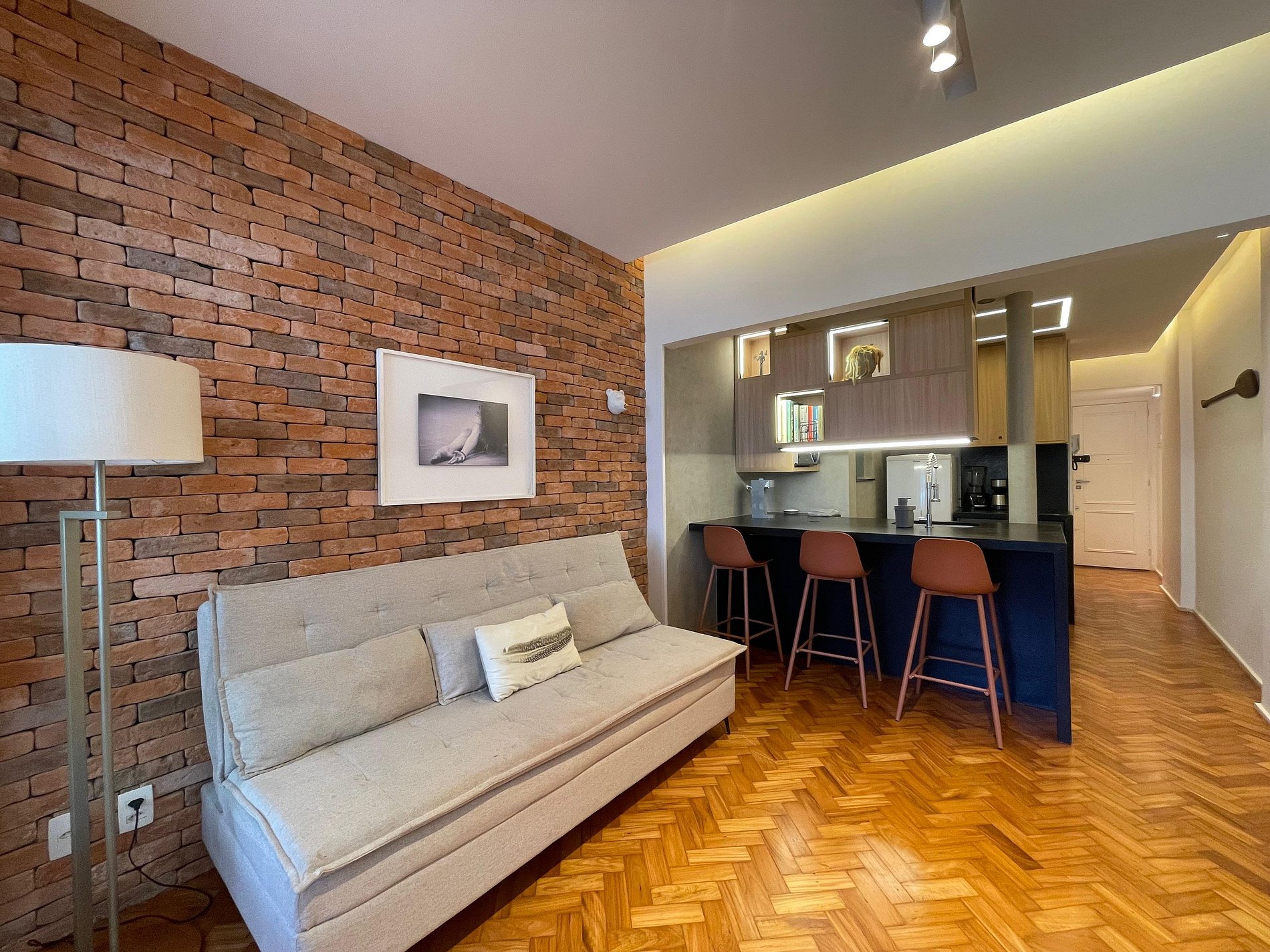 A sala integrada recebe com um estilo moderno e despojado: uma parede de tijolinho exposto traz personalidade, mantendo o charme carioca. O sofá-cama oferece conforto e praticidade, ideal para momentos de descanso, leitura ou uma taça de vinho ao fim do dia. A cama queen está posicionada de forma funcional, criando um ambiente fluido e acolhedor, com uma atmosfera que convida ao refúgio. A cozinha americana, compacta e bem distribuída, une funcionalidade e estilo. Aberta ao espaço principal, permite preparar suas refeições sem perder a conexão com o ambiente. No banheiro, a ducha espaçosa e eficiente transforma o banho em um momento relaxante, completando o conforto deste studio com personalidade.