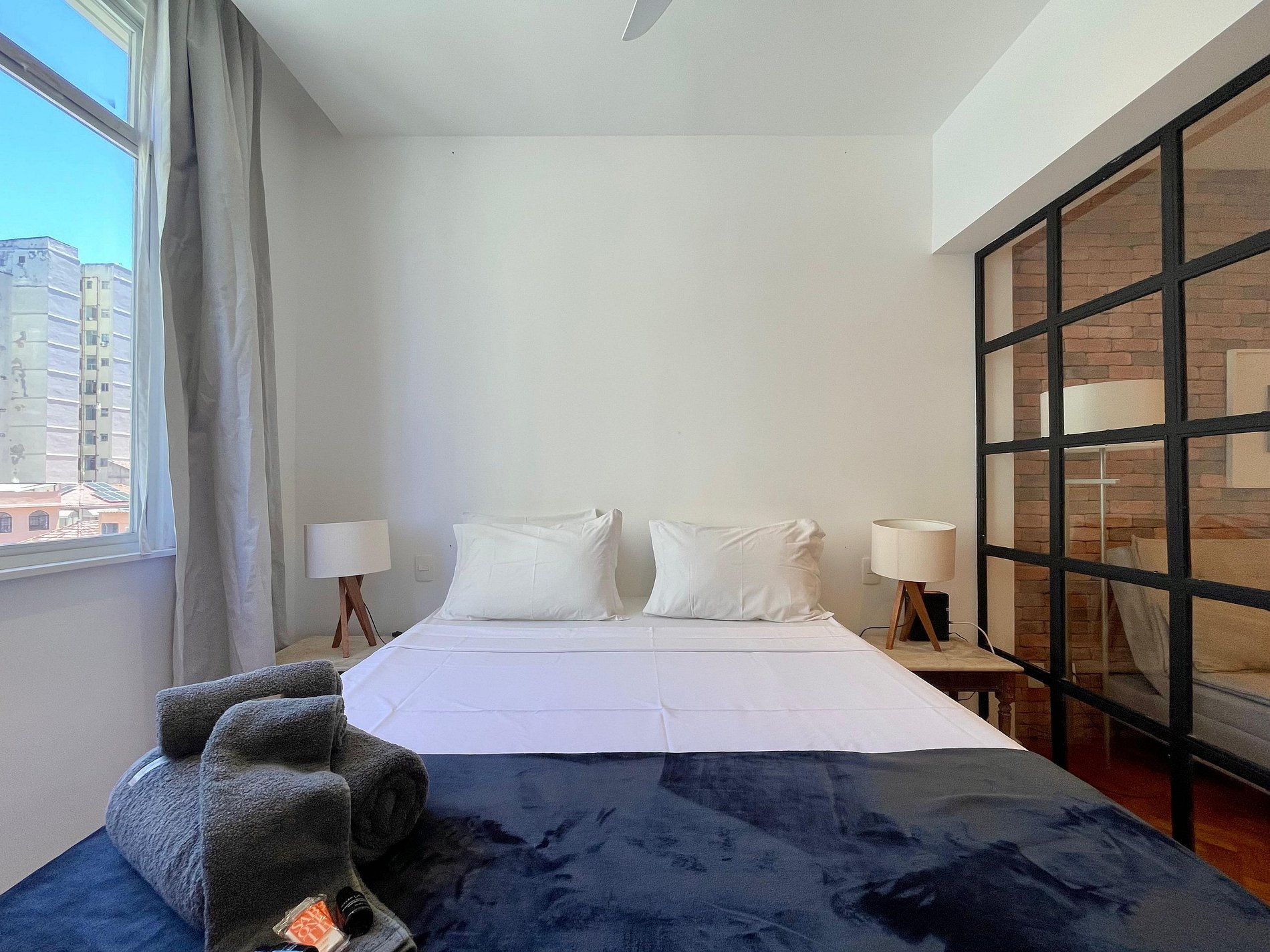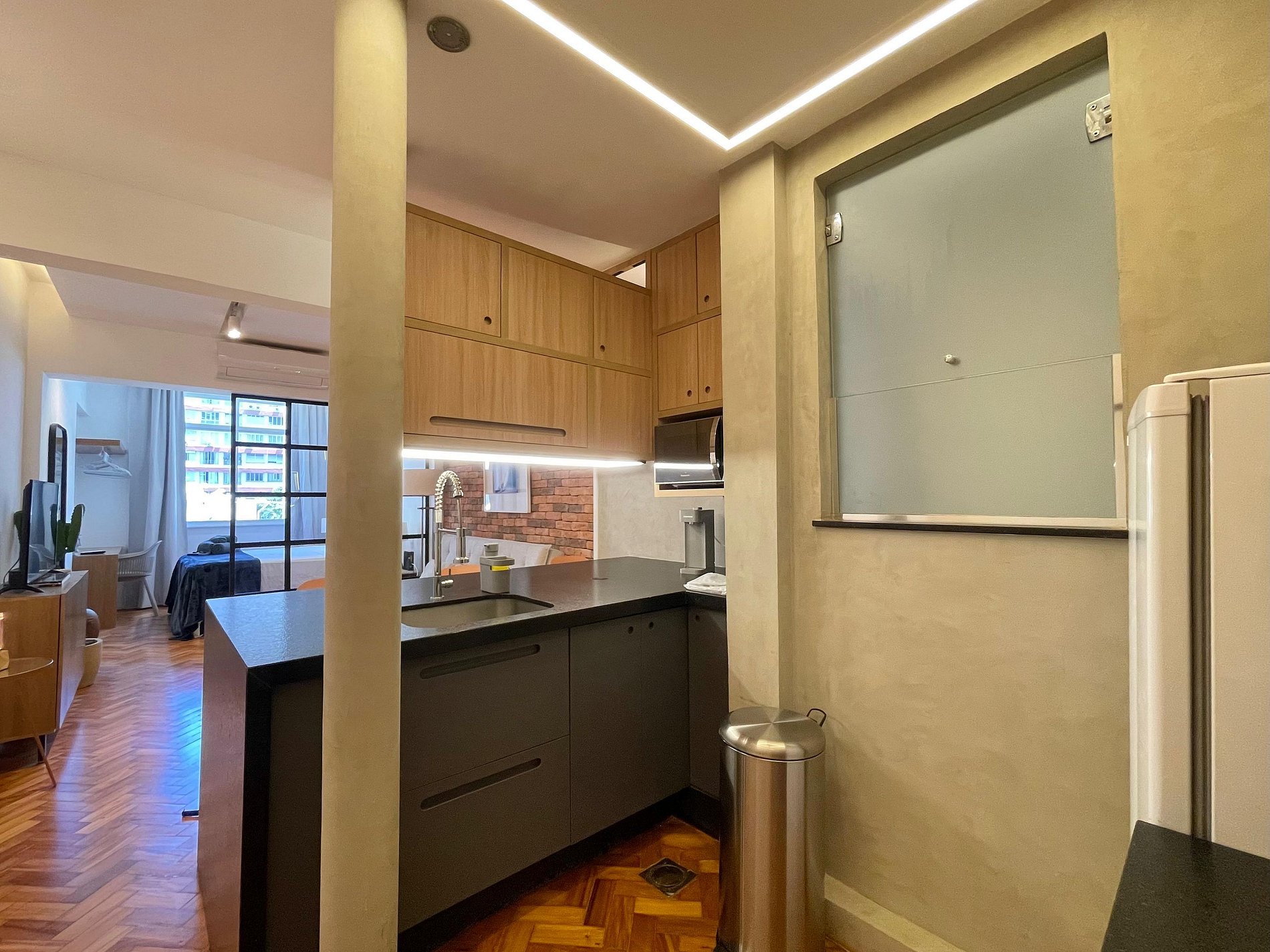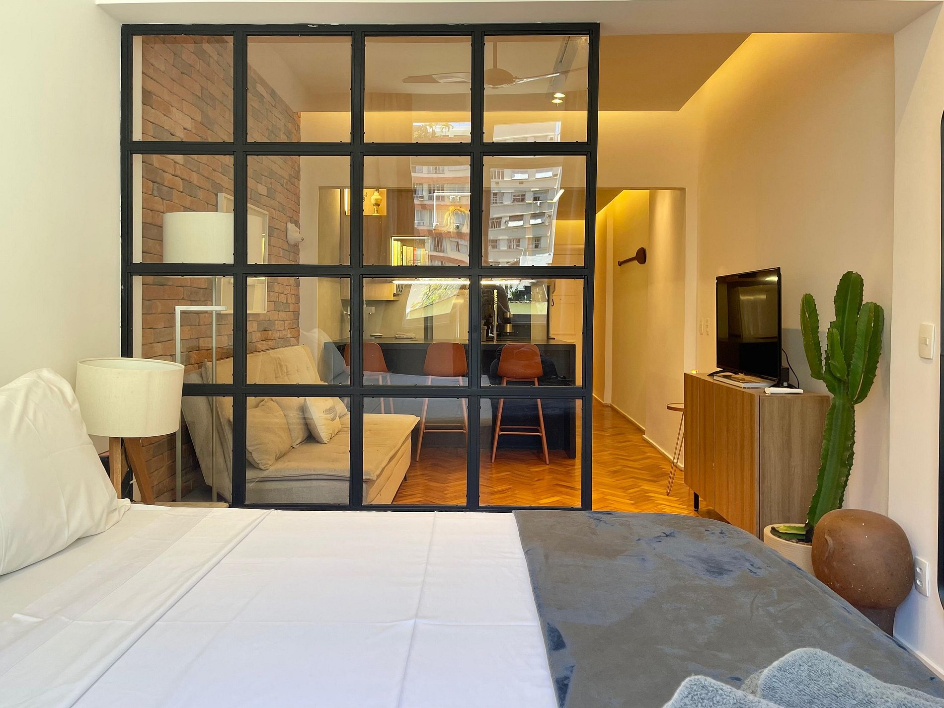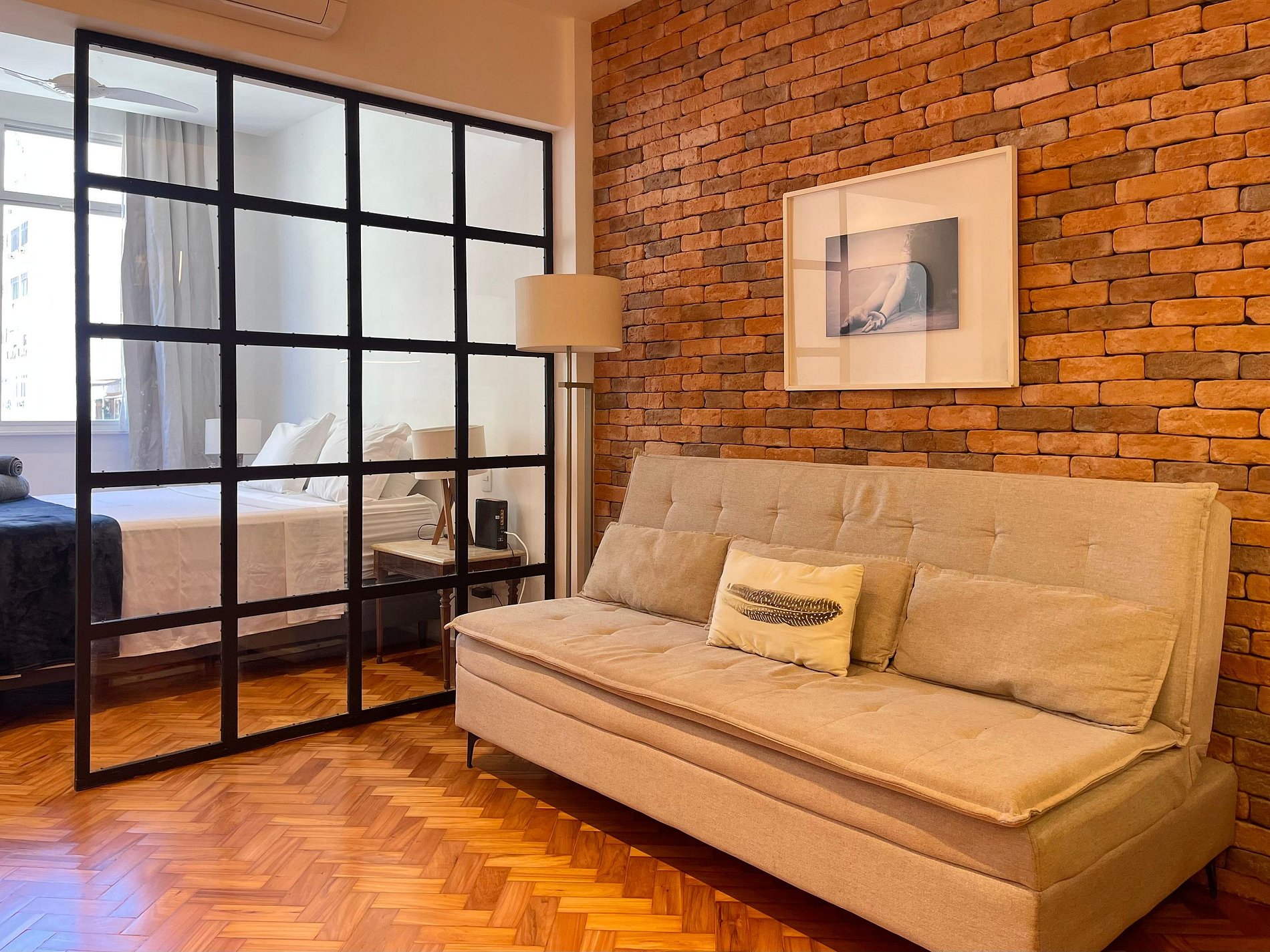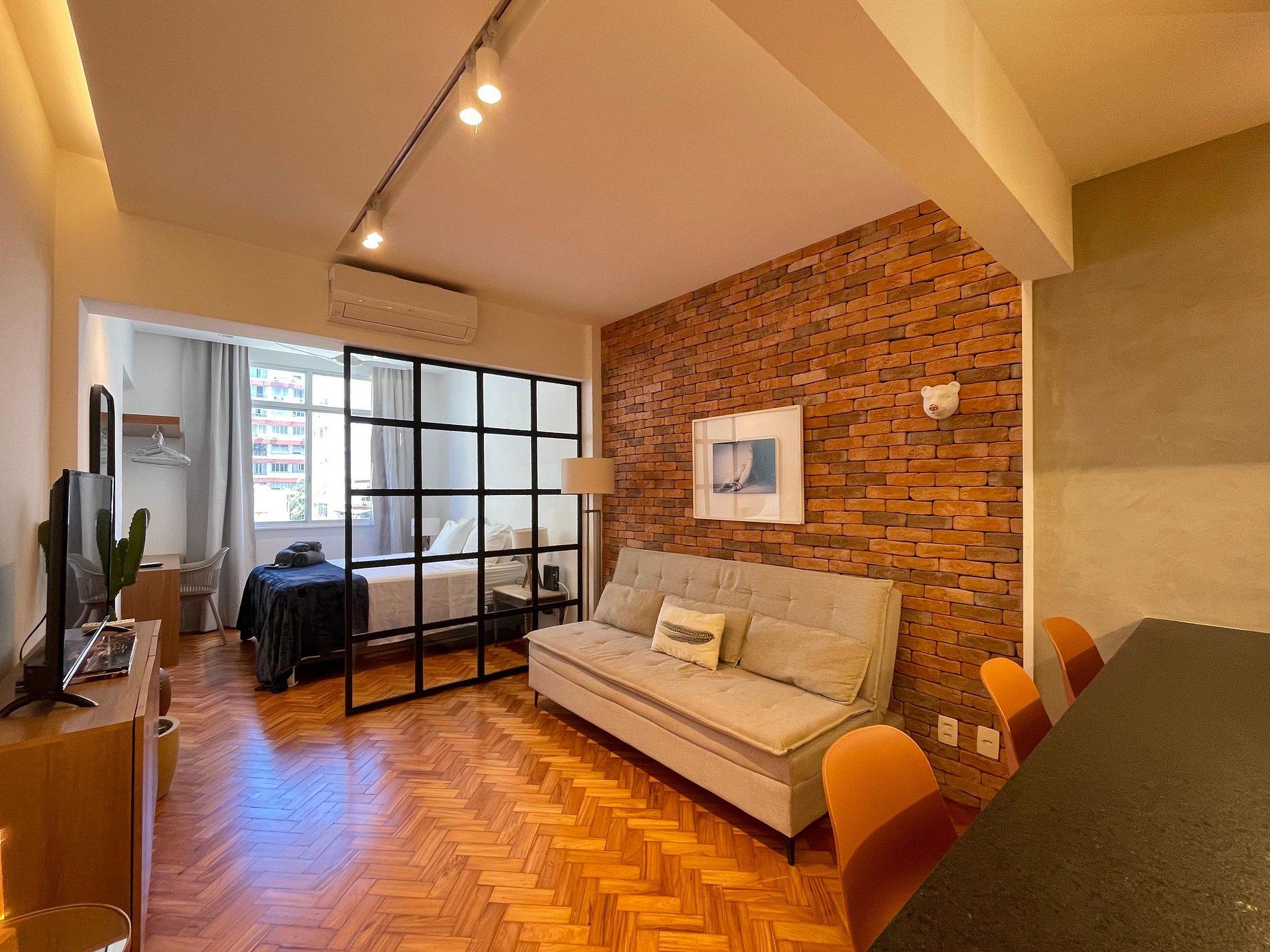 A sala integrada recebe com um estilo moderno e despojado: uma parede de tijolinho exposto traz personalidade, mantendo o charme carioca. O sofá-cama oferece conforto e praticidade, ideal para momentos de descanso, leitura ou uma taça de vinho ao fim do dia. A cama queen está posicionada de forma funcional, criando um ambiente fluido e acolhedor, com uma atmosfera que convida ao refúgio. A cozinha americana, compacta e bem distribuída, une funcionalidade e estilo. Aberta ao espaço principal, permite preparar suas refeições sem perder a conexão com o ambiente. No banheiro, a ducha espaçosa e eficiente transforma o banho em um momento relaxante, completando o conforto deste studio com personalidade.
