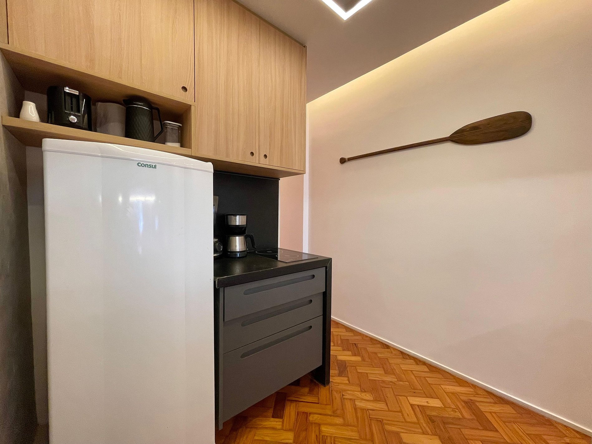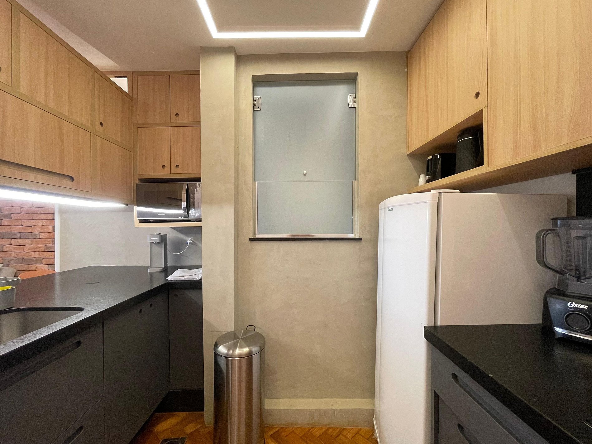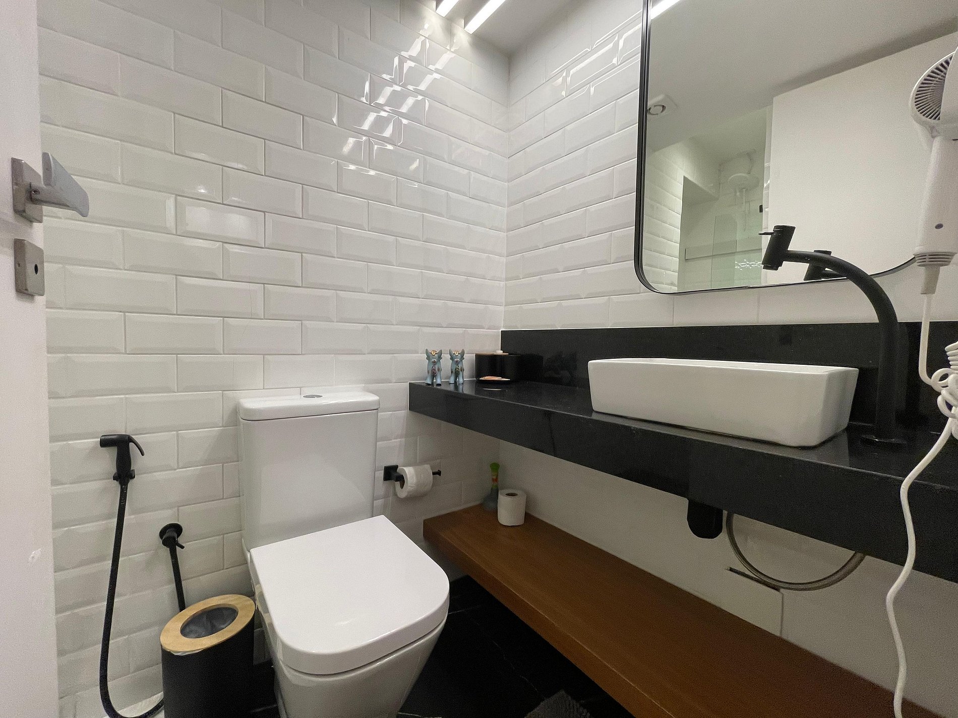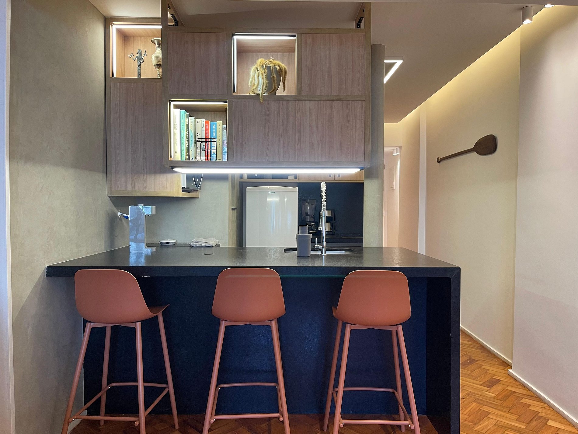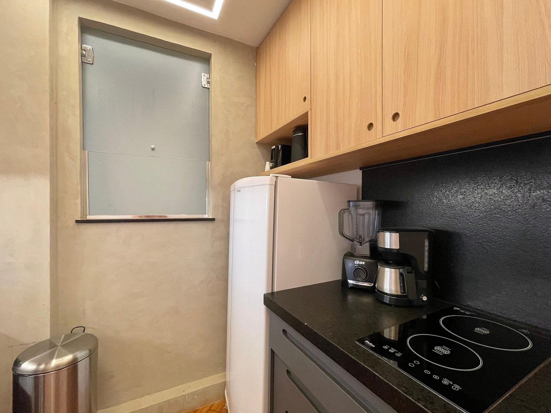 A sala integrada recebe com um estilo moderno e despojado: uma parede de tijolinho exposto traz personalidade, mantendo o charme carioca. O sofá-cama oferece conforto e praticidade, ideal para momentos de descanso, leitura ou uma taça de vinho ao fim do dia. A cama queen está posicionada de forma funcional, criando um ambiente fluido e acolhedor, com uma atmosfera que convida ao refúgio. A cozinha americana, compacta e bem distribuída, une funcionalidade e estilo. Aberta ao espaço principal, permite preparar suas refeições sem perder a conexão com o ambiente. No banheiro, a ducha espaçosa e eficiente transforma o banho em um momento relaxante, completando o conforto deste studio com personalidade.