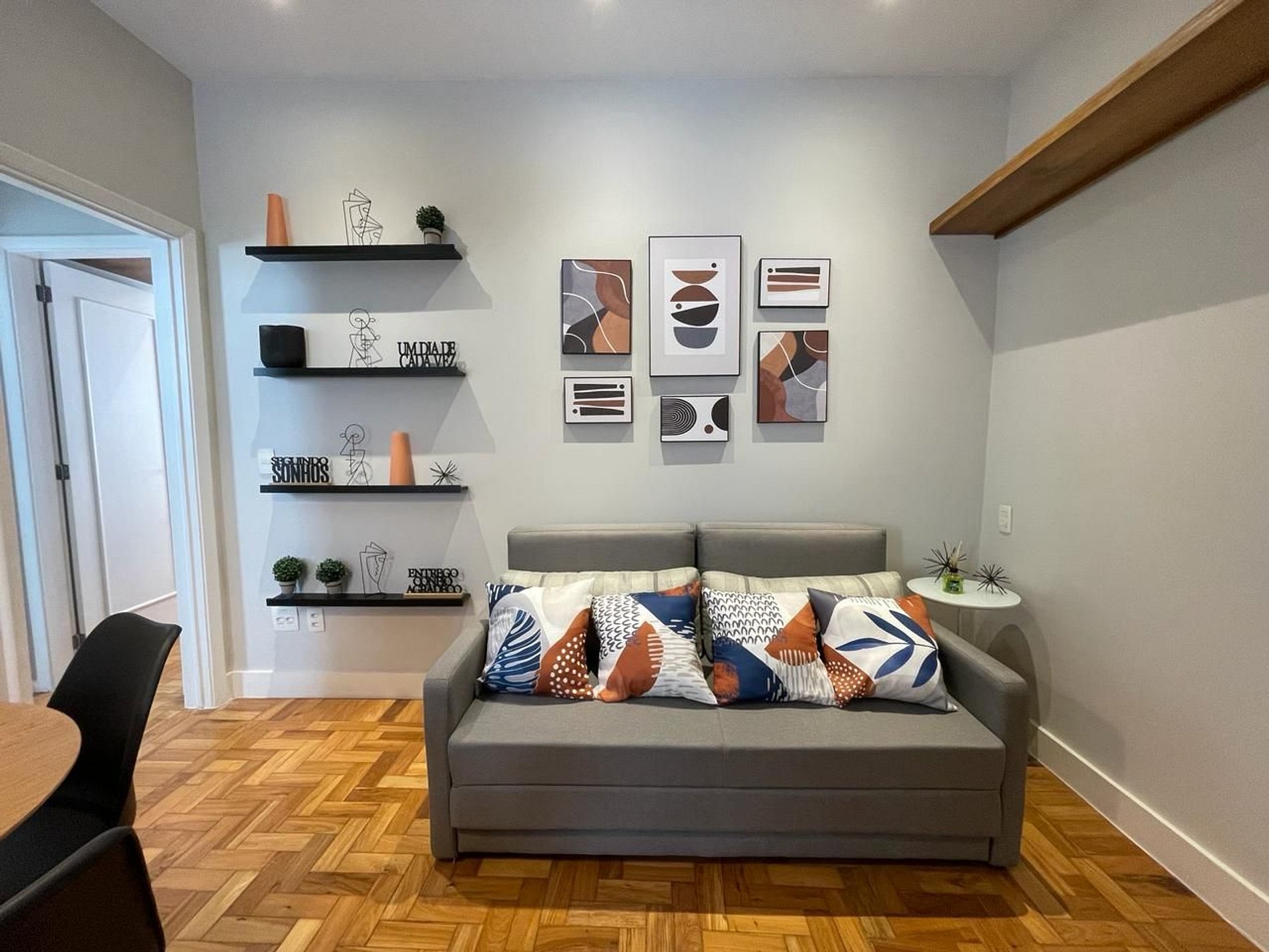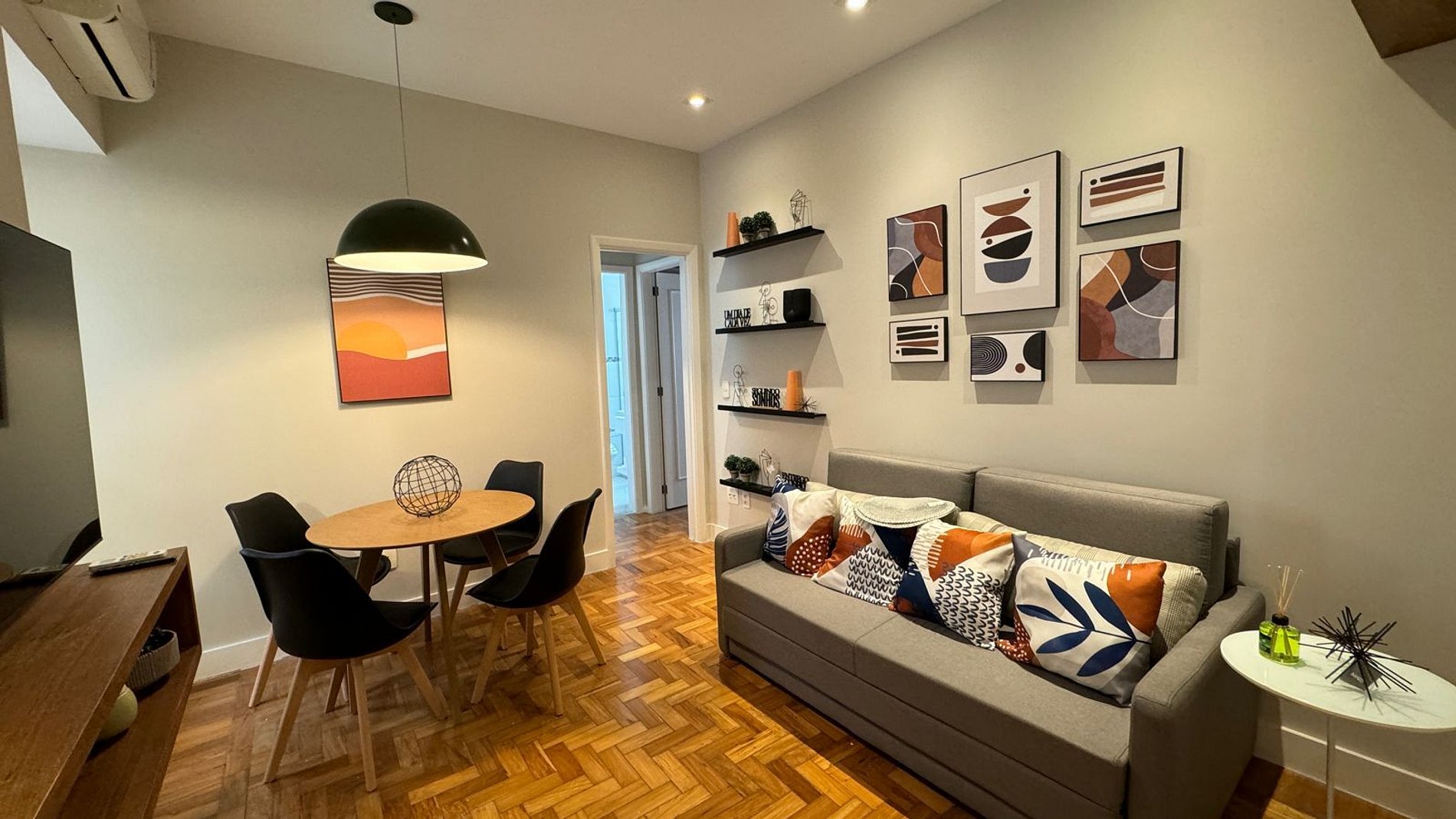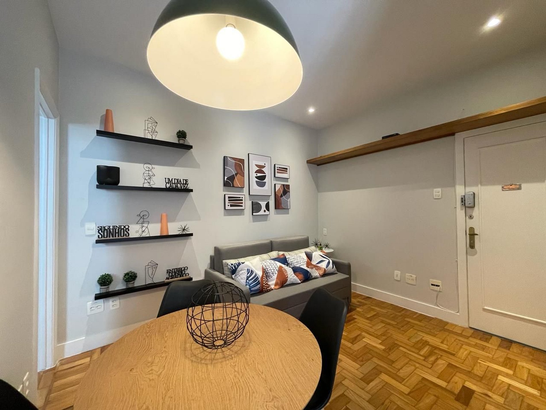 O apartamento é dividido em 1 quarto com cama queen size, sala de jantar e estar com sofá-cama, banheiro social e cozinha.