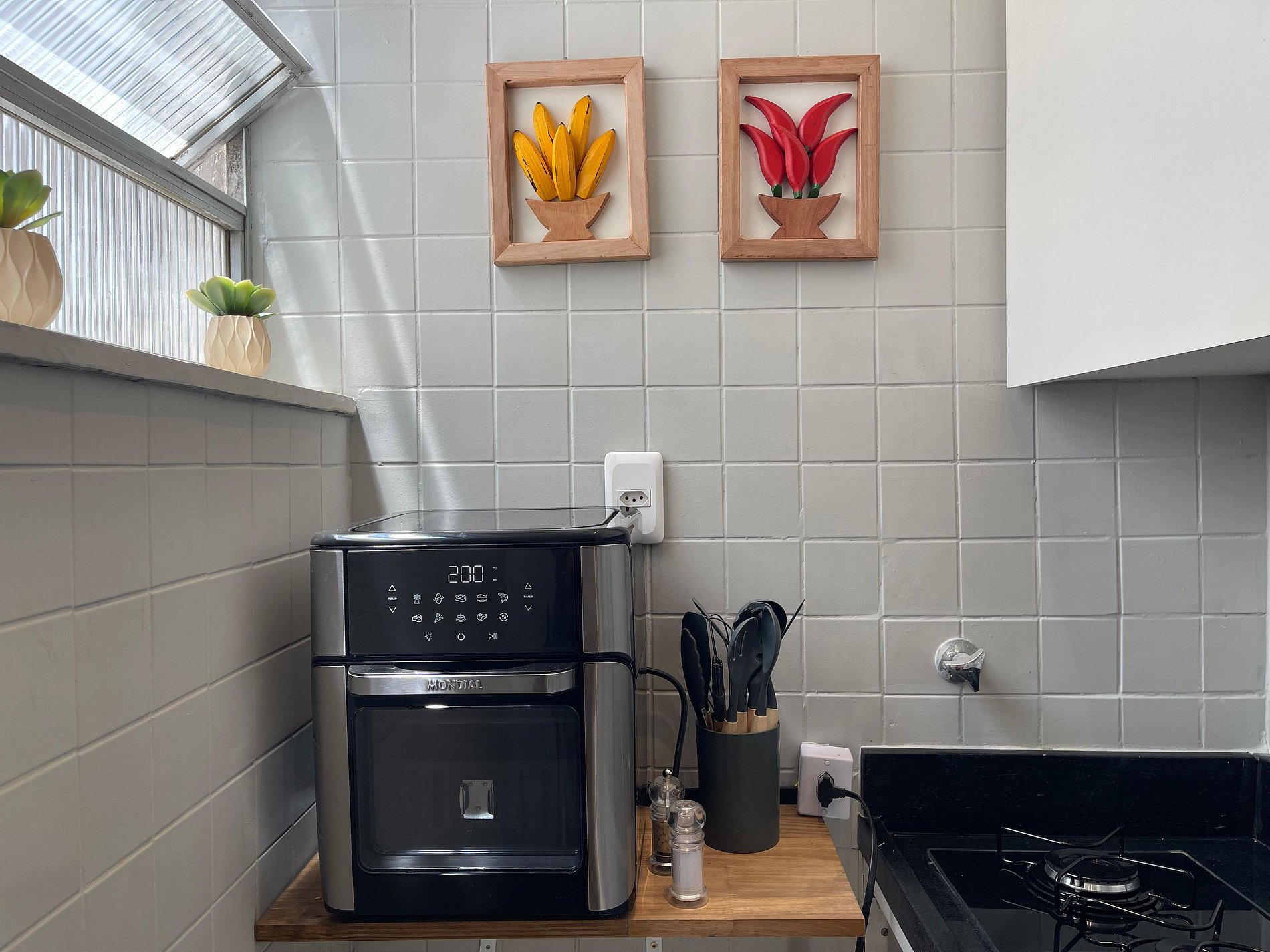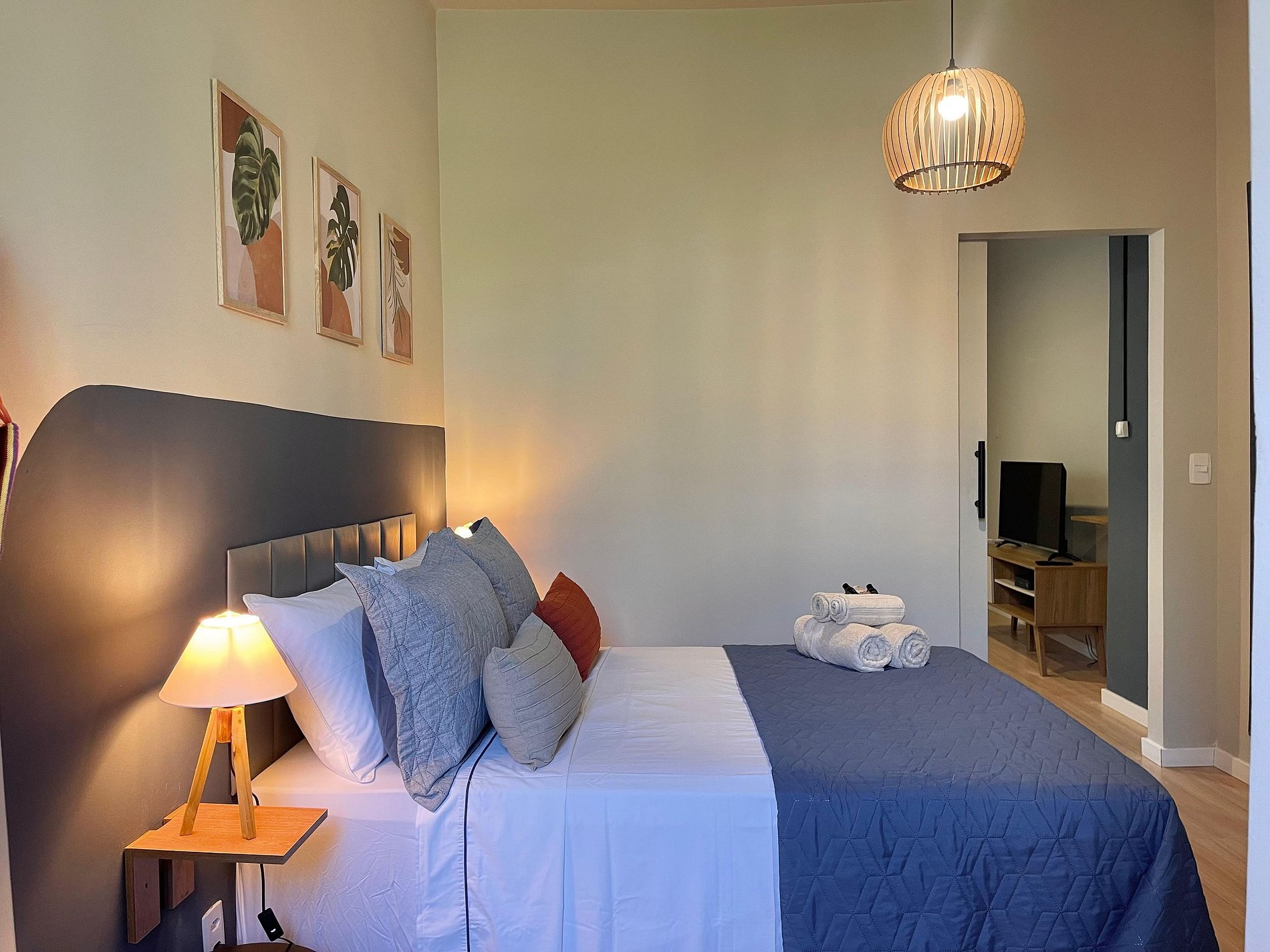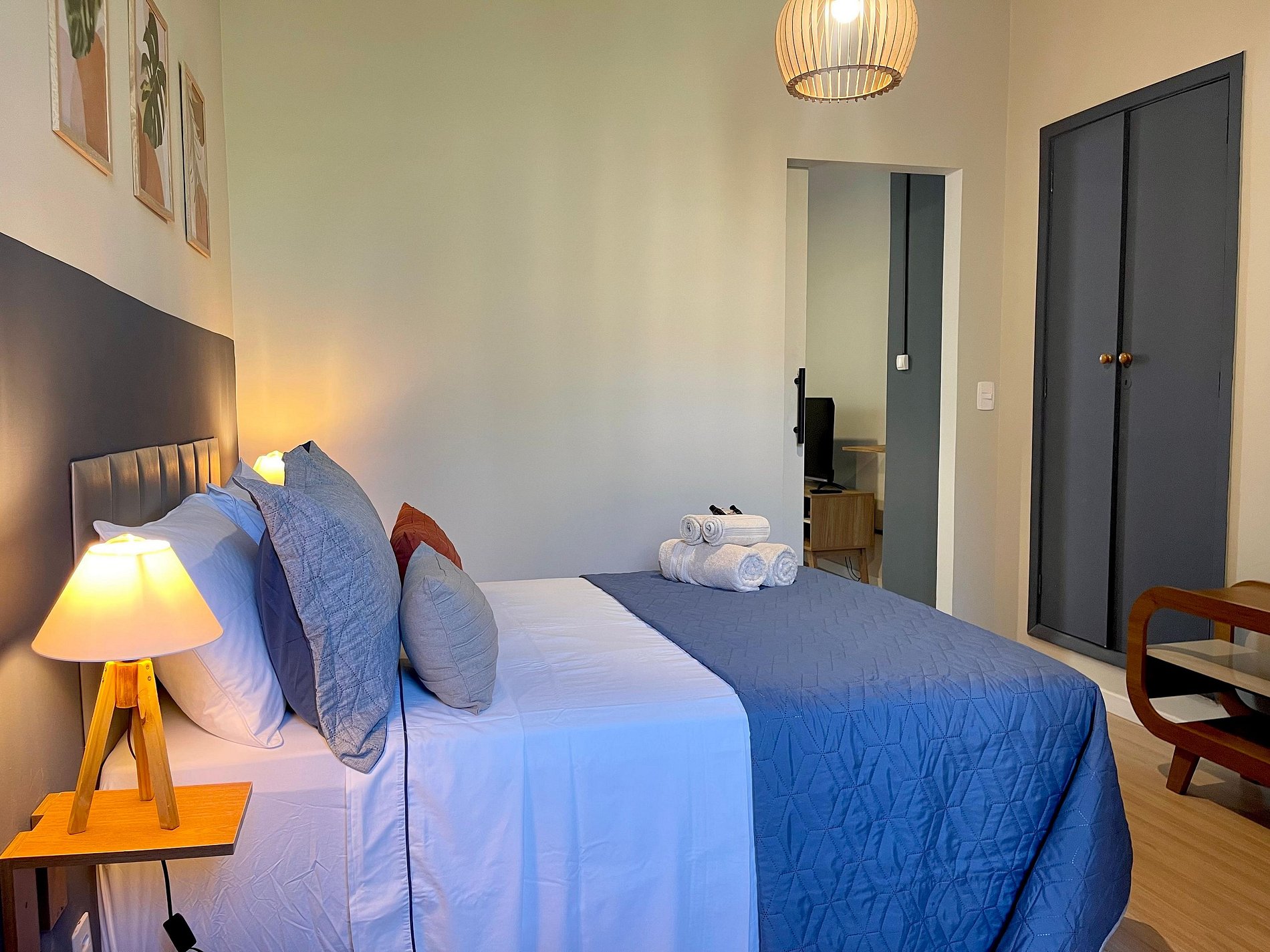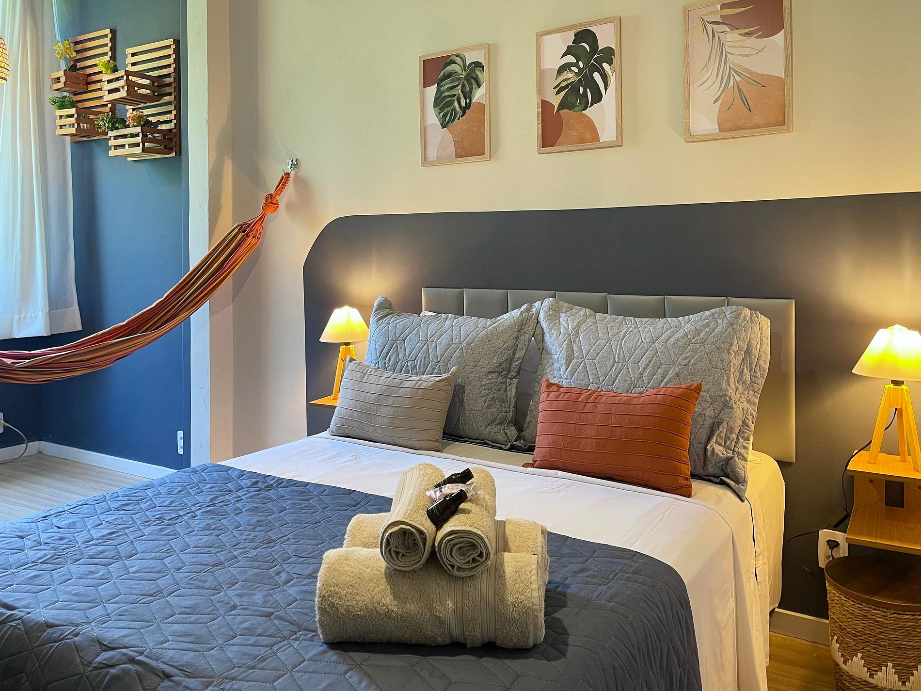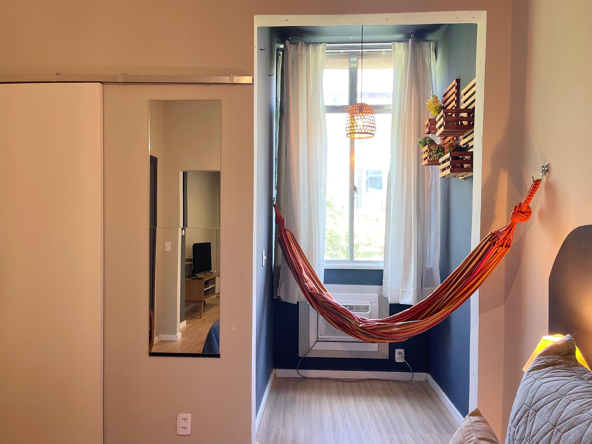 O quarto possui cama de casal (1,38 m x 1,88 m), armário, uma rede próxima à janela e ar-condicionado de parede (modelo tradicional, não split). O banheiro é completo, com chuveiro elétrico. A sala conta com sofá-cama, ventilador de teto, televisão e mesa de jantar, atendendo bem tanto para descanso quanto para refeições ou trabalho. A cozinha é prática e equipada com geladeira, cooktop a gás, airfryer, micro-ondas e filtro de água.
