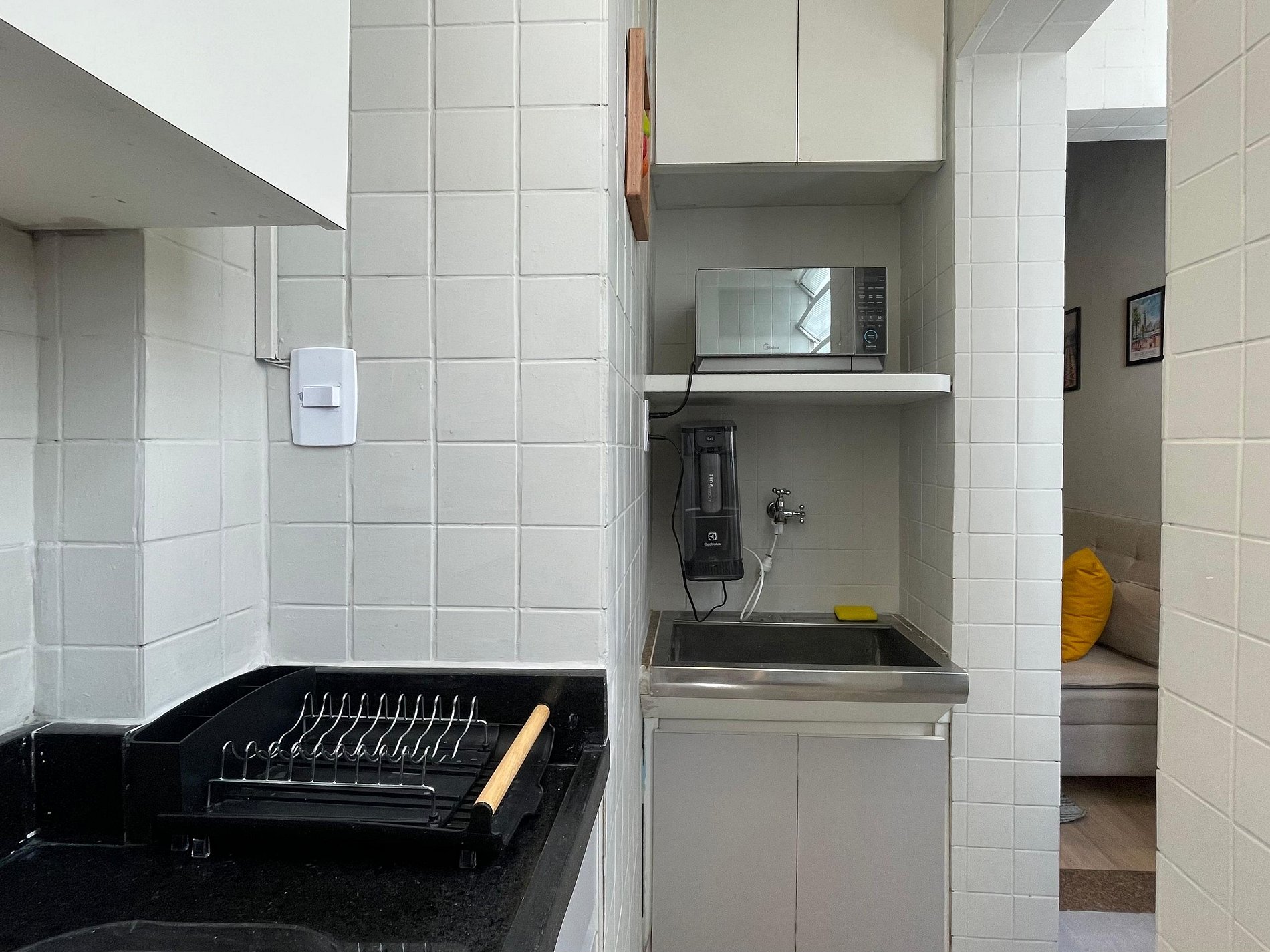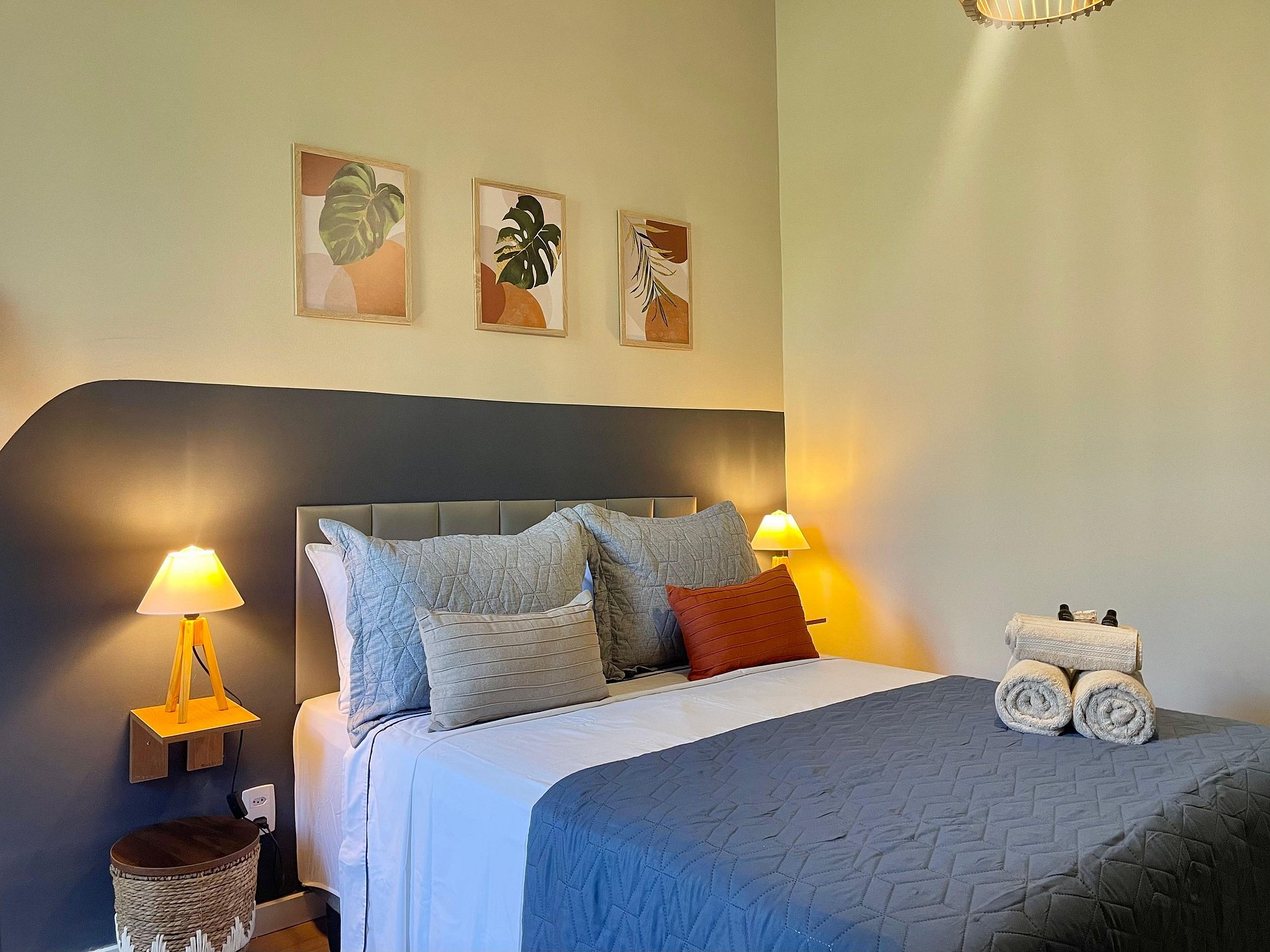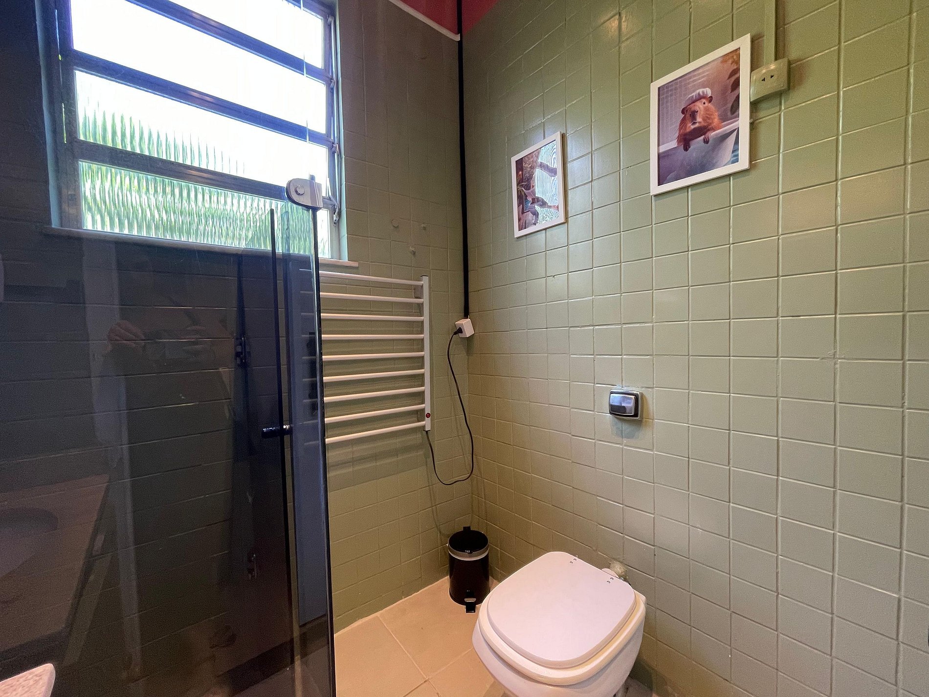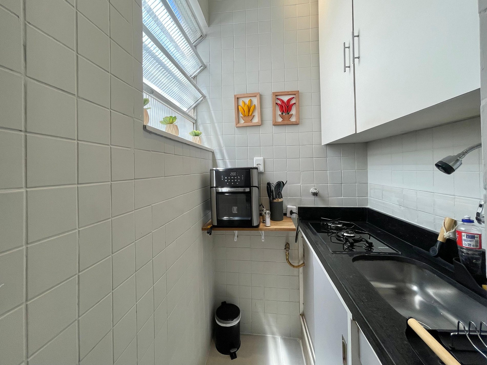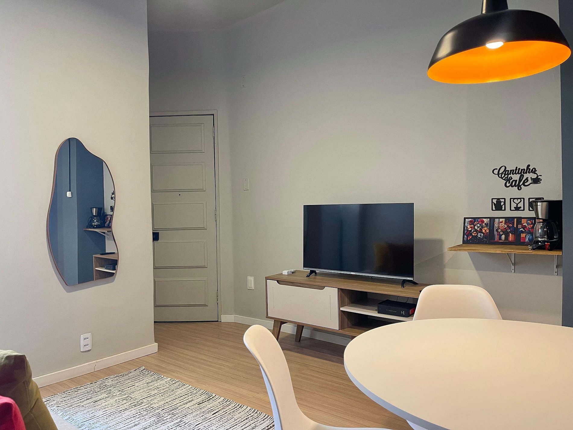 O quarto possui cama de casal (1,38 m x 1,88 m), armário, uma rede próxima à janela e ar-condicionado de parede (modelo tradicional, não split). O banheiro é completo, com chuveiro elétrico. A sala conta com sofá-cama, ventilador de teto, televisão e mesa de jantar, atendendo bem tanto para descanso quanto para refeições ou trabalho. A cozinha é prática e equipada com geladeira, cooktop a gás, airfryer, micro-ondas e filtro de água.