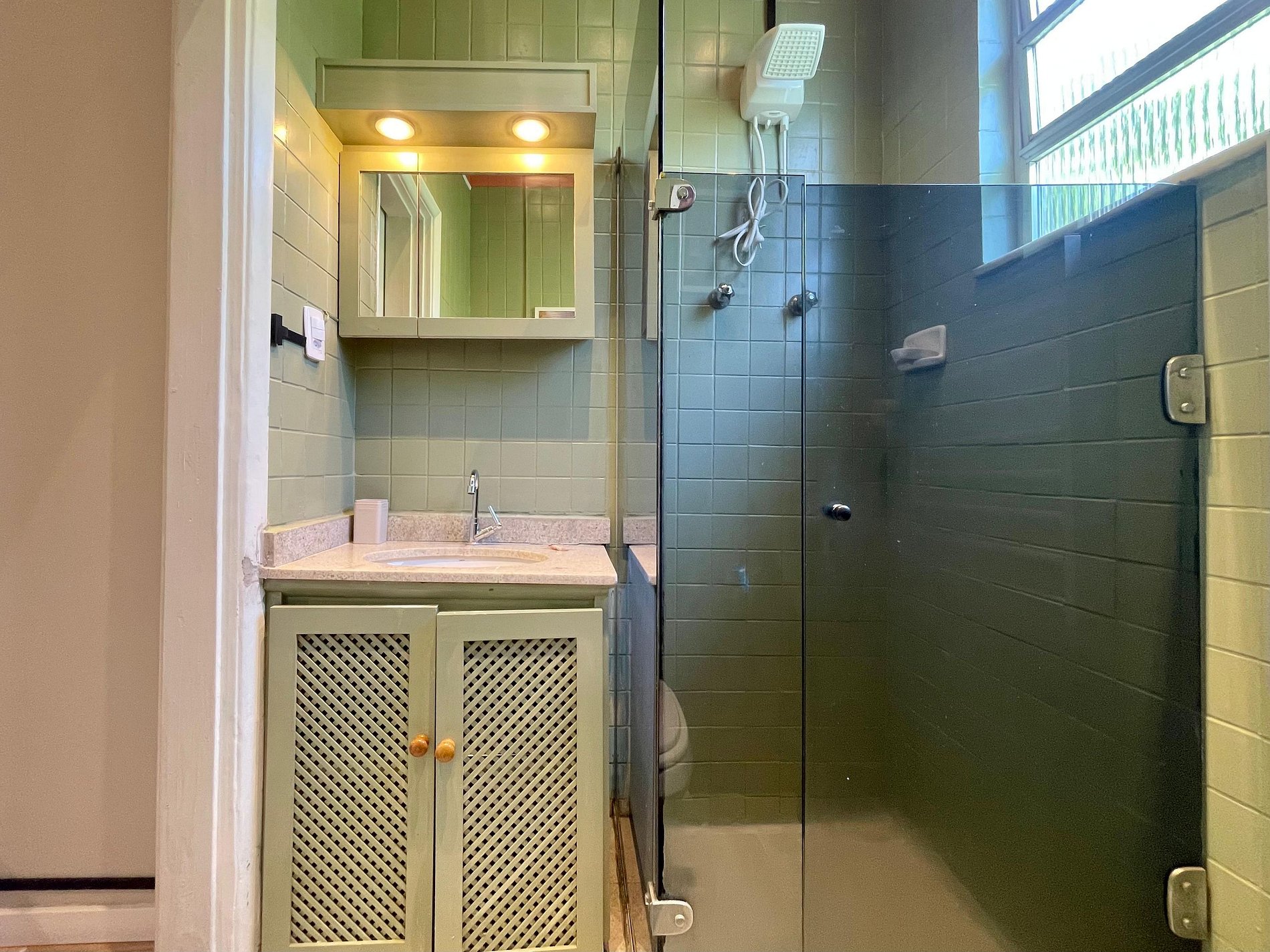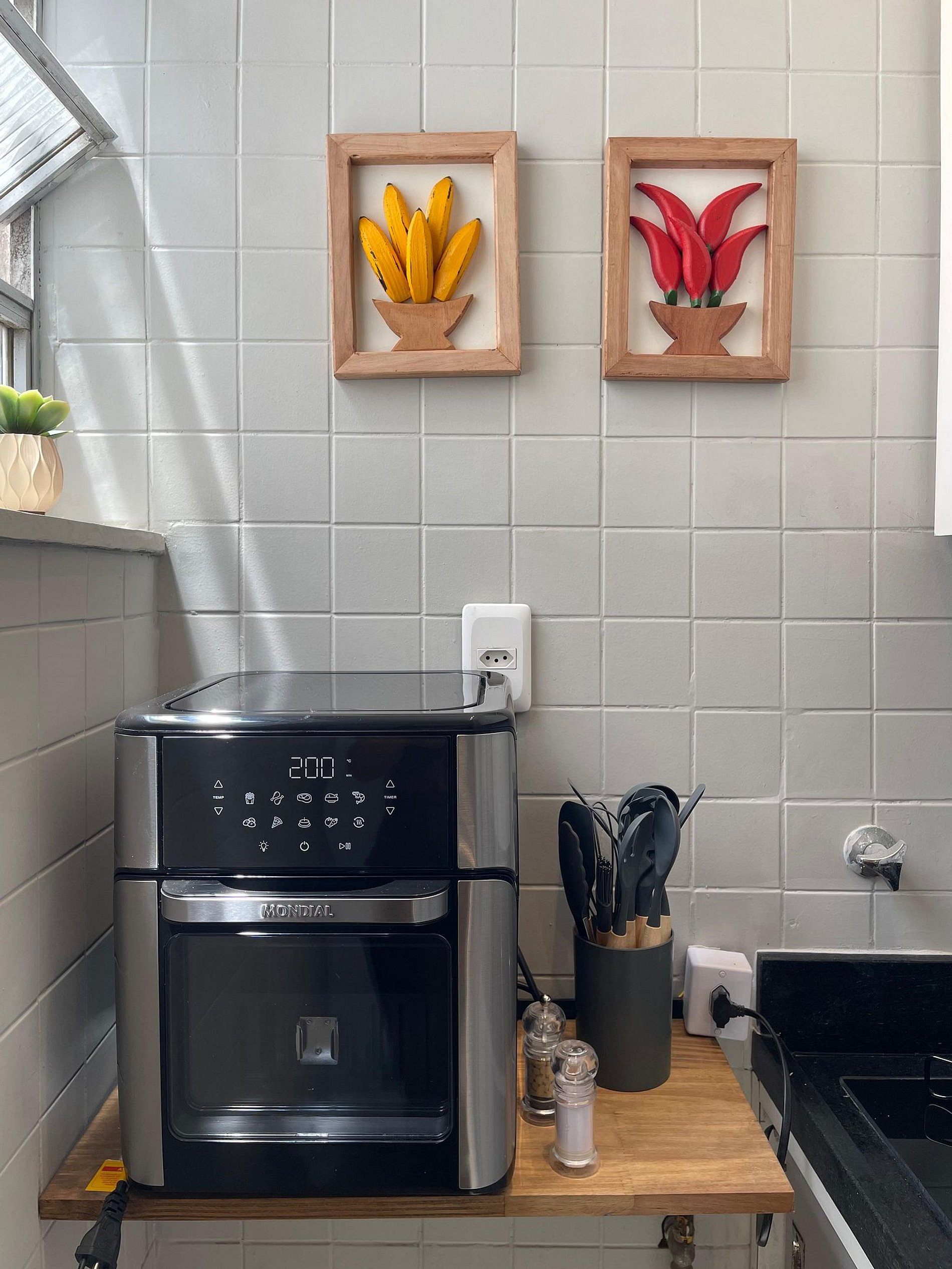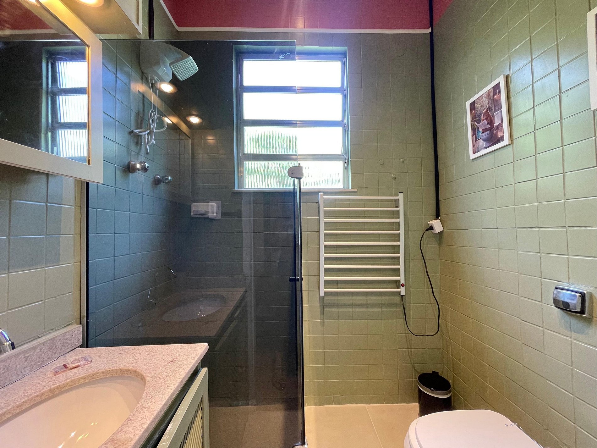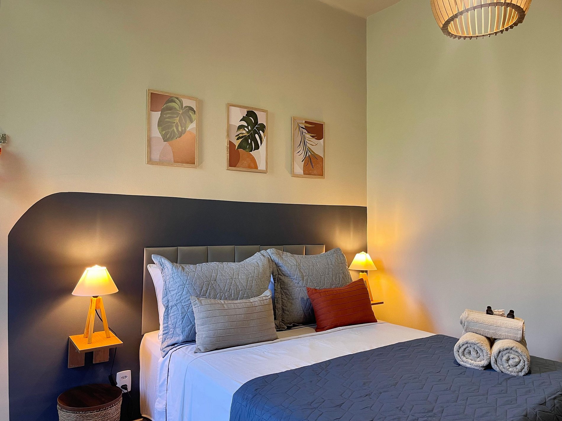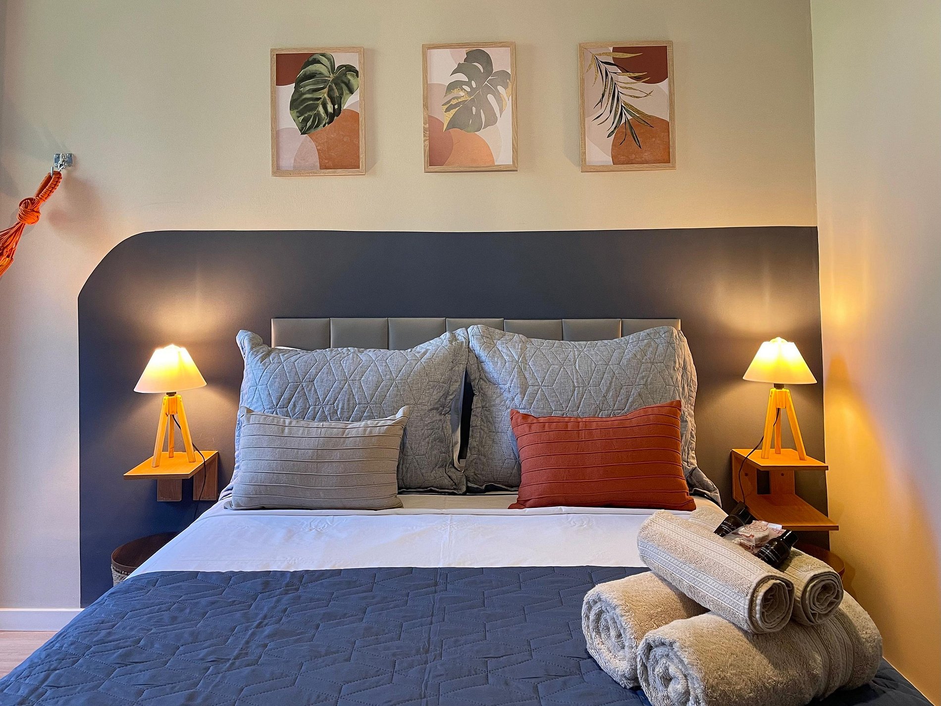 O quarto possui cama de casal (1,38 m x 1,88 m), armário, uma rede próxima à janela e ar-condicionado de parede (modelo tradicional, não split). O banheiro é completo, com chuveiro elétrico. A sala conta com sofá-cama, ventilador de teto, televisão e mesa de jantar, atendendo bem tanto para descanso quanto para refeições ou trabalho. A cozinha é prática e equipada com geladeira, cooktop a gás, airfryer, micro-ondas e filtro de água.