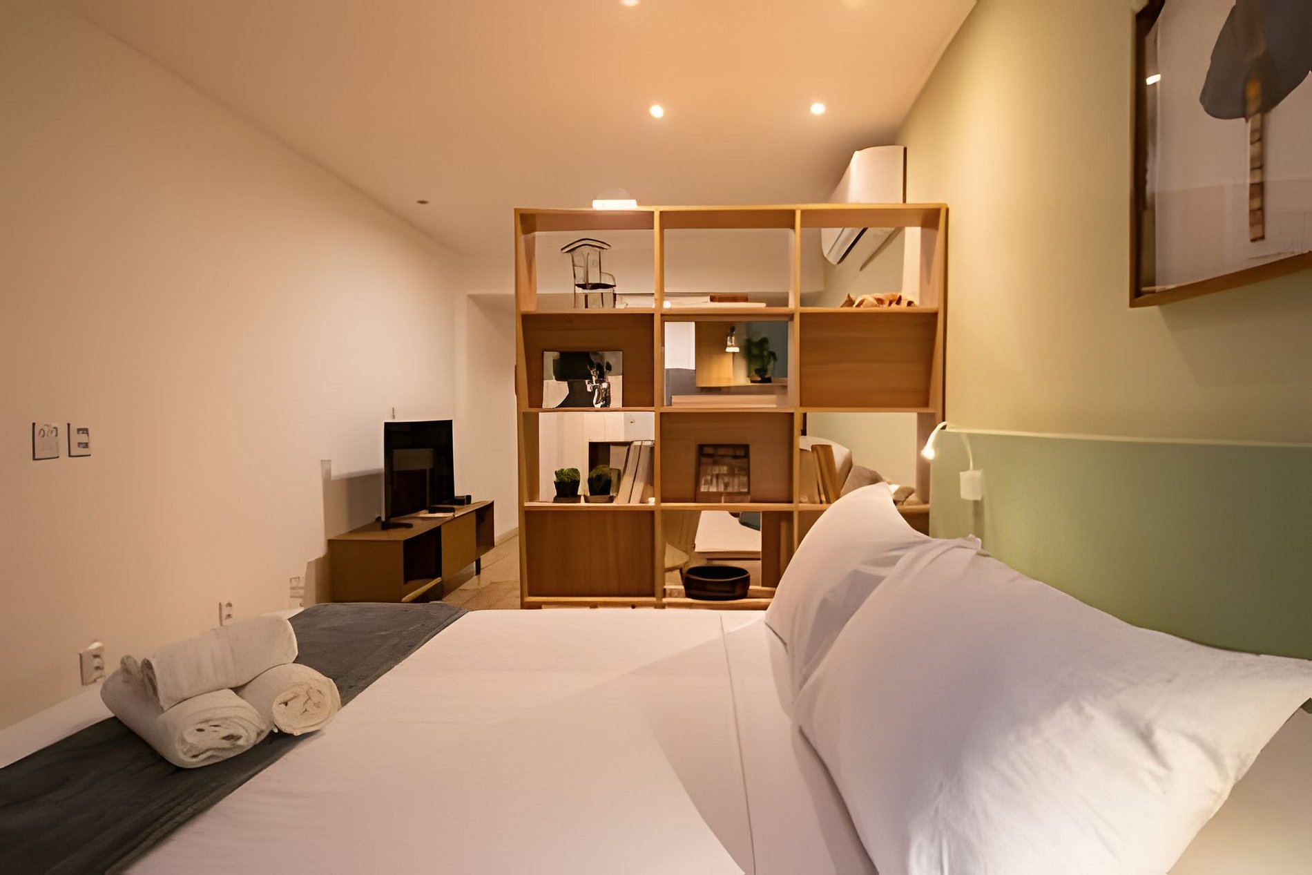 A sala é o convite inicial: ampla, leve, com tons neutros e texturas naturais. O sofá-cama acolhe com conforto e praticidade, perfeito para momentos de descanso, leitura ou uma taça de vinho ao fim da tarde. A poucos passos, a cama queen repousa em um ambiente integrado e acolhedor, com privacidade sutil e atmosfera de refúgio.