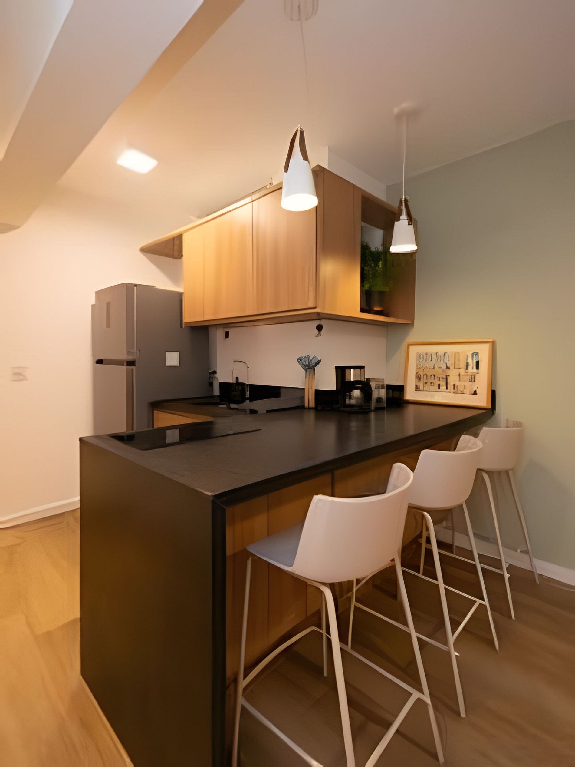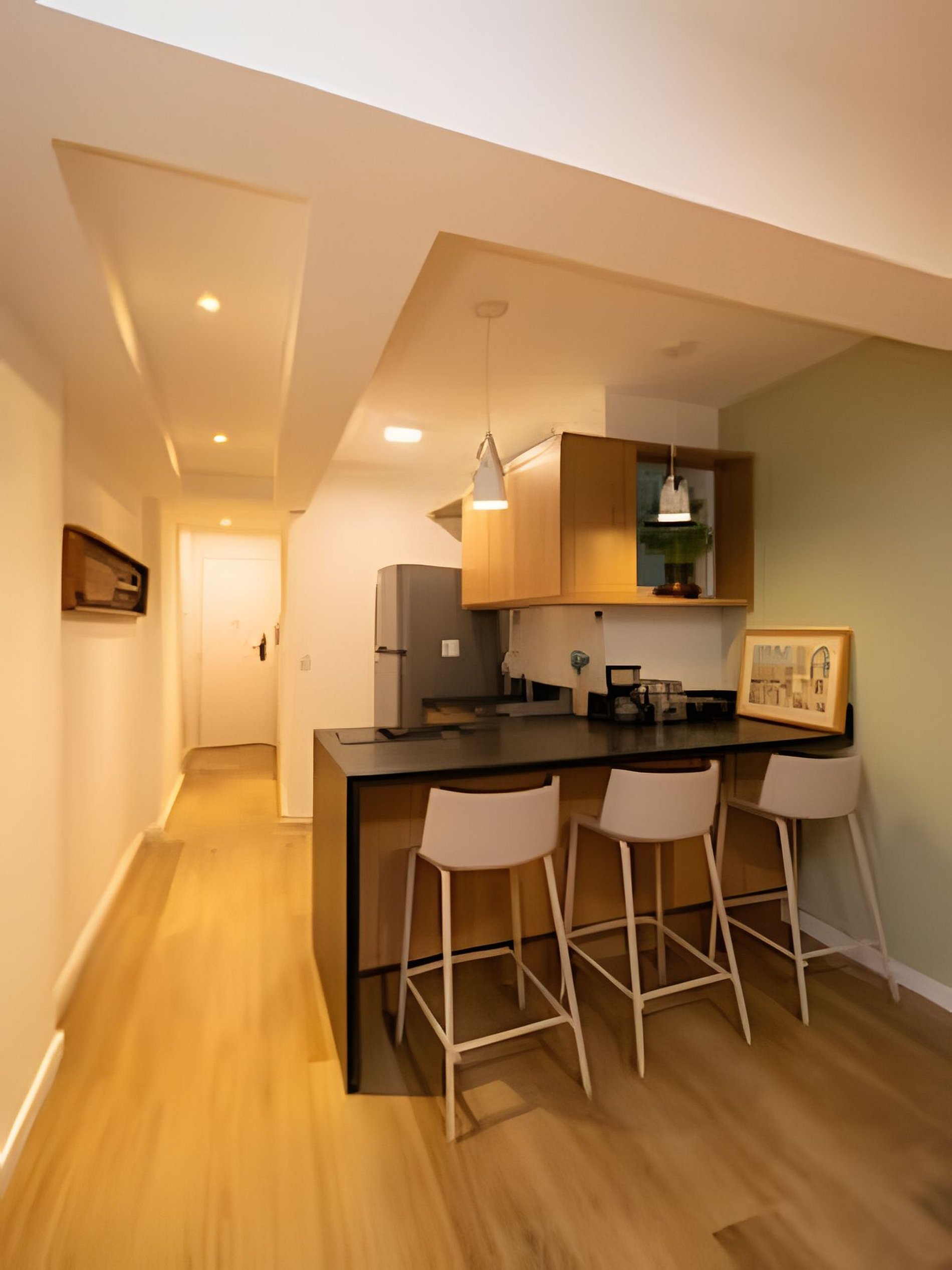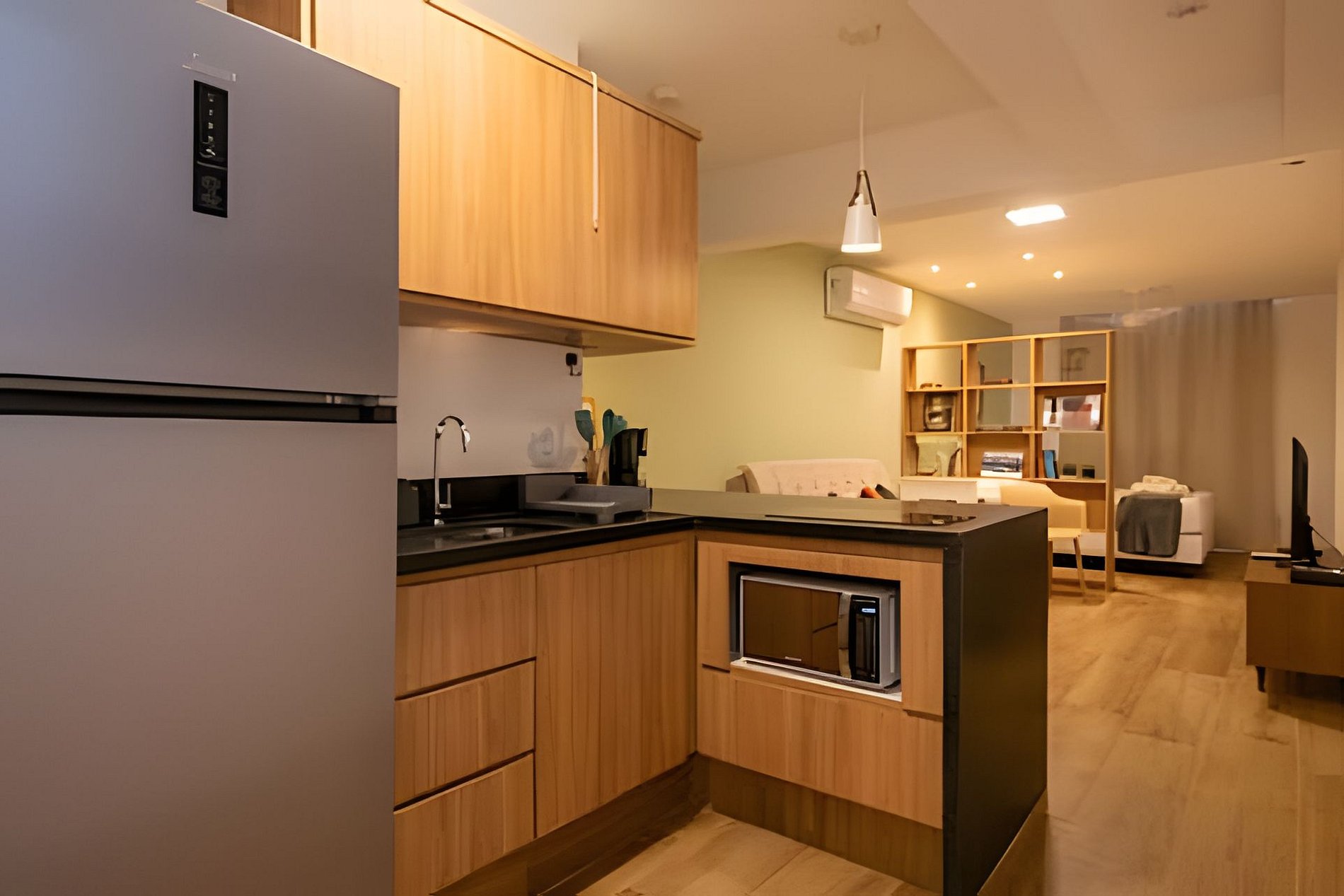 A cozinha americana completa o espaço com funcionalidade e charme. Aberta e conectada, ela permite preparar suas refeições sem perder o clima do ambiente.